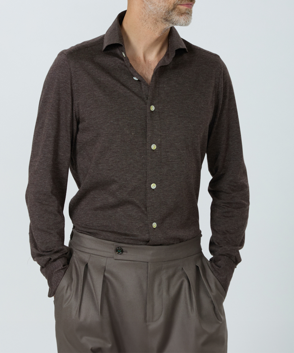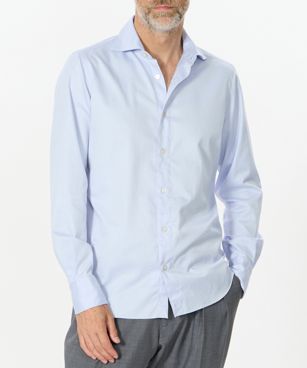 今回、チェックしたのは、ナポリの老舗シャツブランド「マリア・サンタンジェロ」から、台襟のないワンピースカラーシャツ。襟羽根が前立てと一枚でつながっているため、ボタンを開けたとき自然なロールが首元に立体感を生みだします。首回りに柔らかく沿いながら、大人のリラックスと品格を両立できる一着なのです。