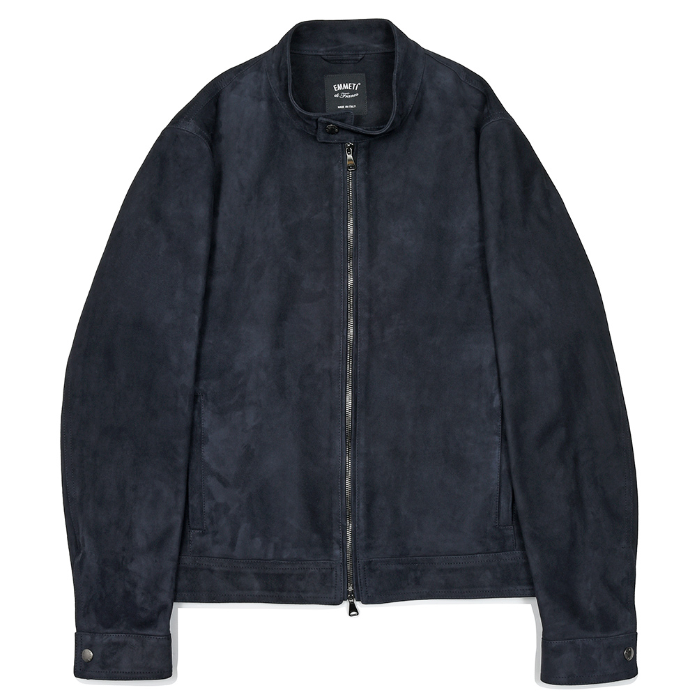 「これはエンメティのBR別注モデル、FIESOLEというライダースなんだ。同じセミダブルのJOSEPHをベースに、異素材をコンビ使いにしているところが新鮮なデザインでしょ。袖と袷の内側はラムレザー、身頃はウールメルトン代わりにカシミアに別注されているのでスーパーラグジュアリーな一着に仕上がっているよ。」