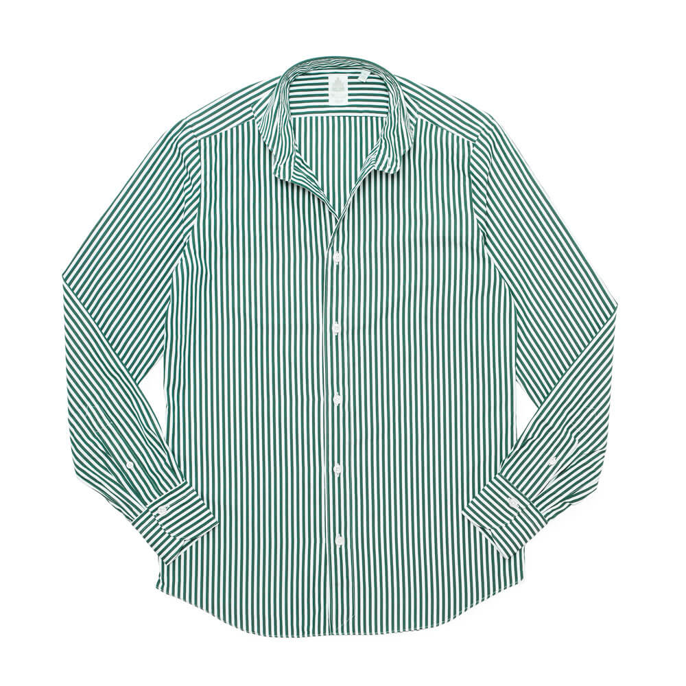 カラーバリエーションも揃うリネンシャツは、ナポリのカミチェリア、マリアサンタンジェロ。台襟のないワンピースカラーは衿羽根がふんわりと返るので、衿高で男っぽく見えるのが特徴です。一般的な台襟つきシャツより優雅に見えて、しかもほどよく上品で知的な印象も漂います。