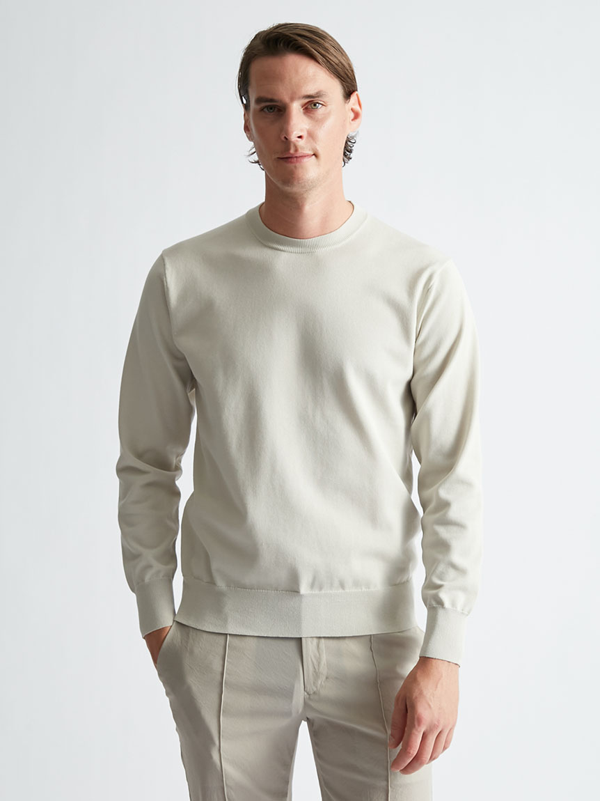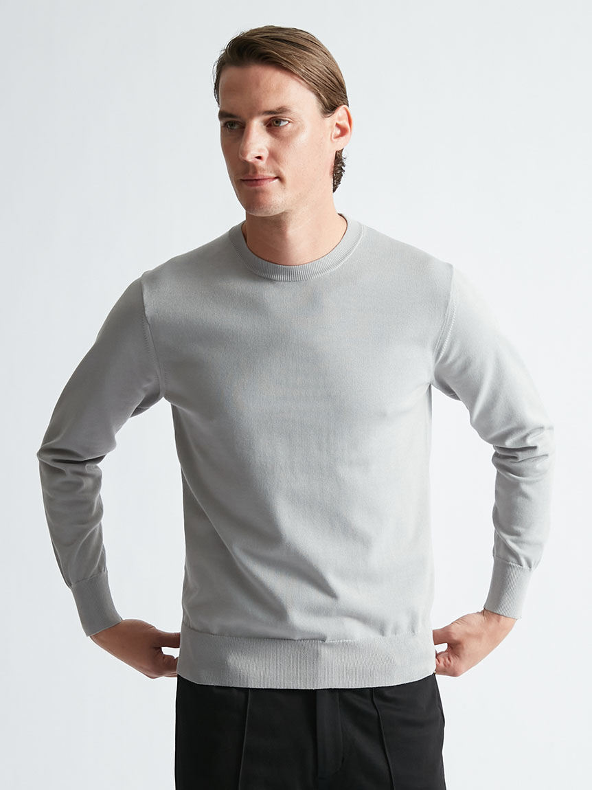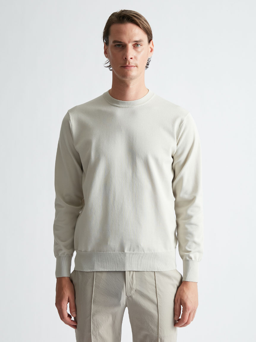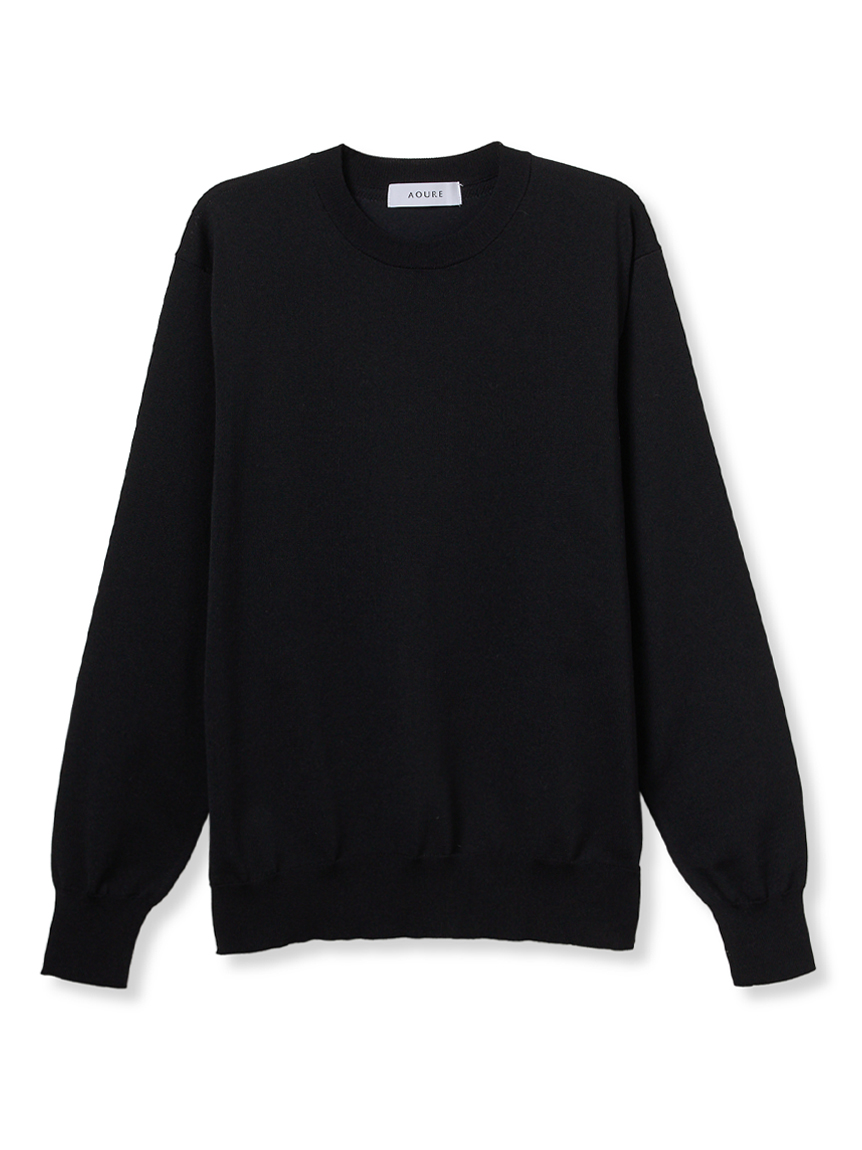 クルーネックは、ネックラインのリブ幅やテンションを繊細に調整し、詰まりすぎず開きすぎないバランスに。