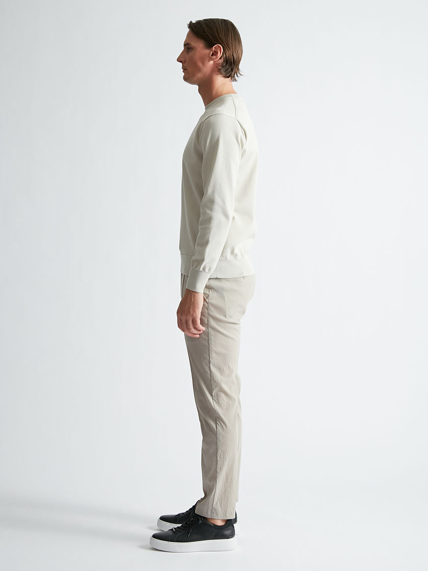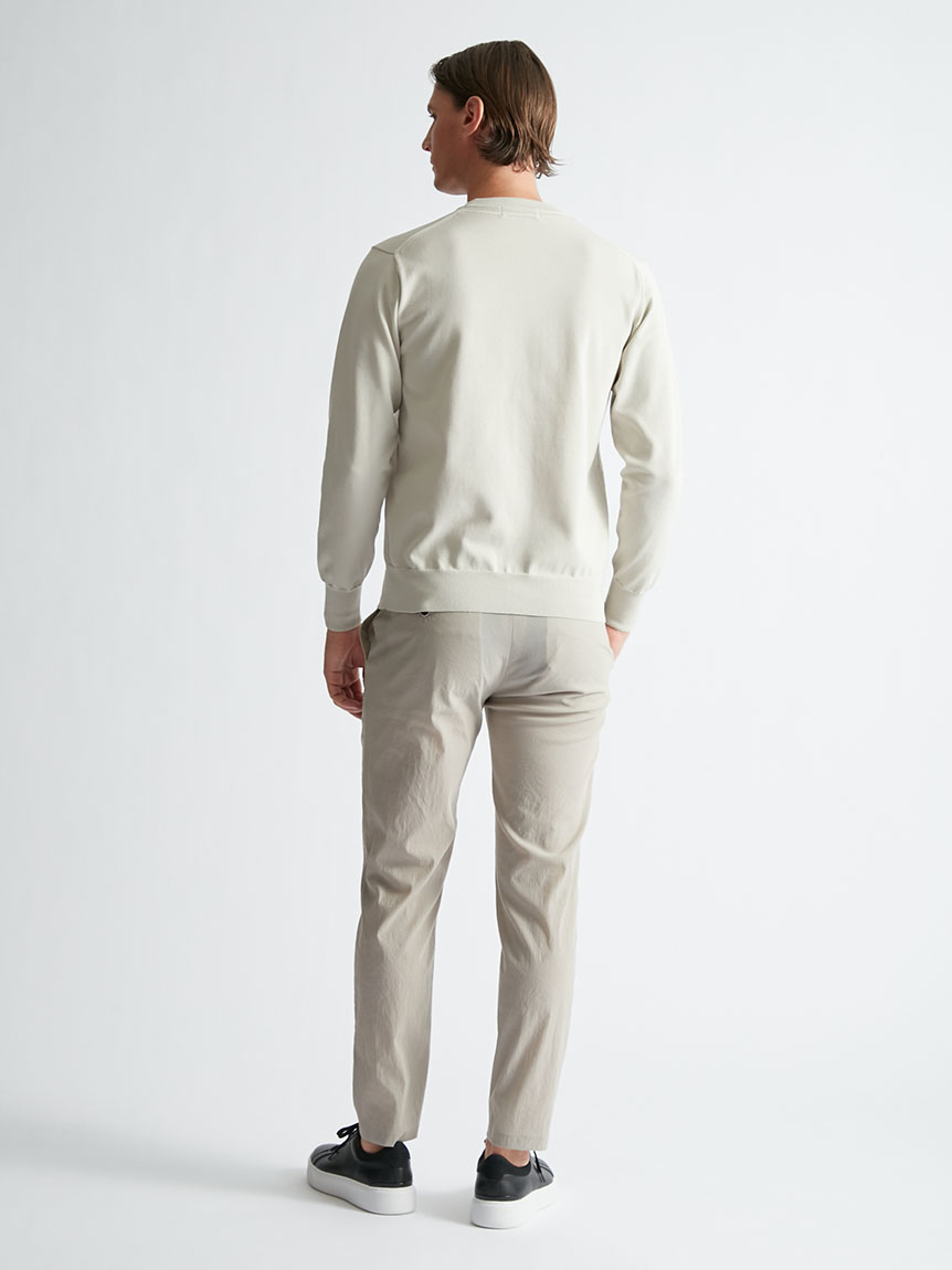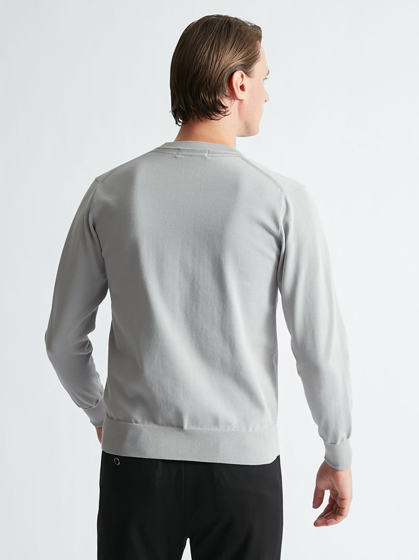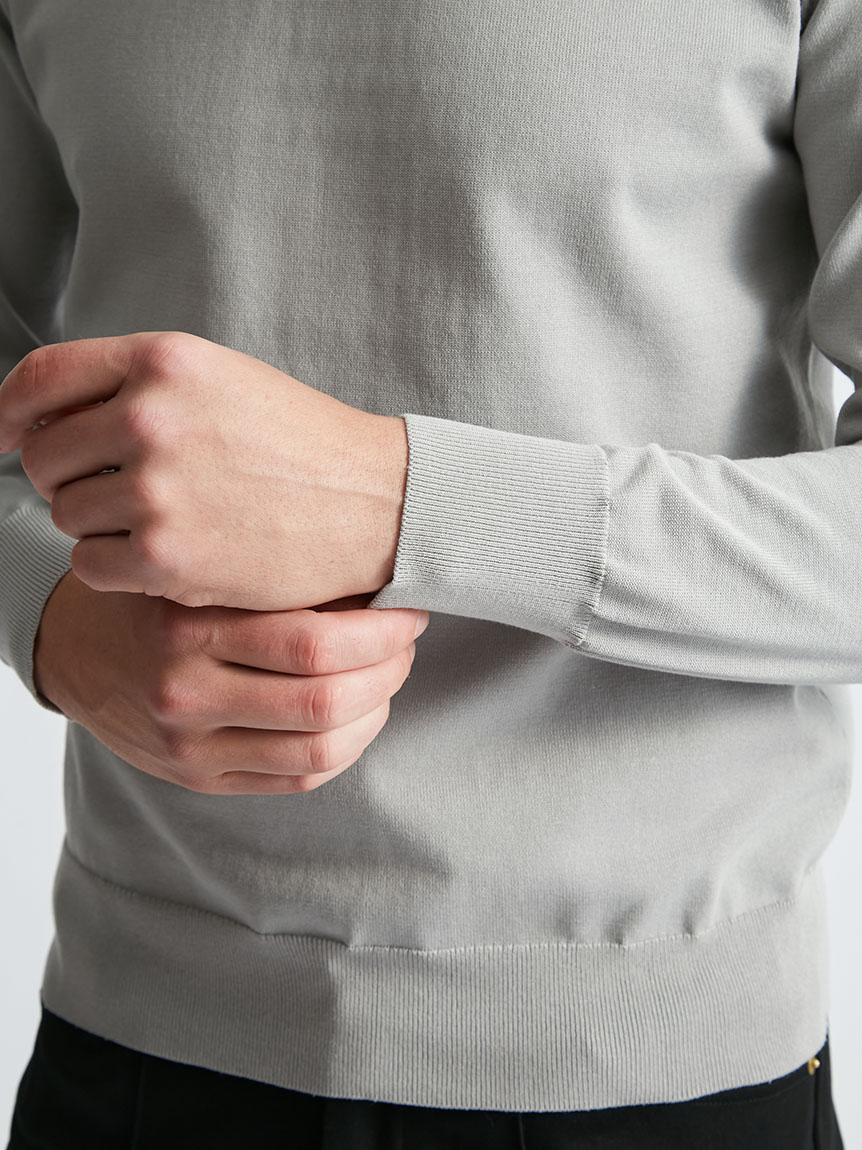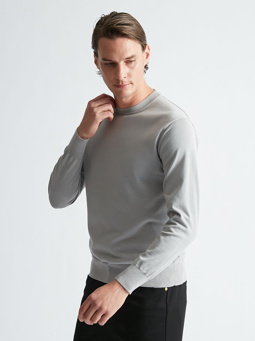 クルーネックは、ネックラインのリブ幅やテンションを繊細に調整し、詰まりすぎず開きすぎないバランスに。