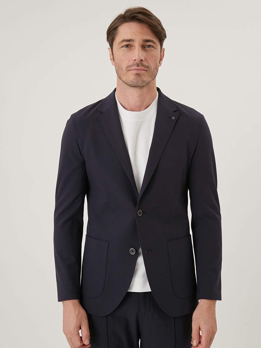 セットアップ対応可能なパンツのシルエットに合わせジャケットもコンパクトに設計し、シャープな顔に仕立てています。フロントのカッティング、腕まわりの設計にこだわり、スタイリッシュな印象にデザインしました。素材の伸縮性を存分にいかし、腕の可動域も広範囲にとれ、シャープなシルエットながら快適な着心地を実現しています。