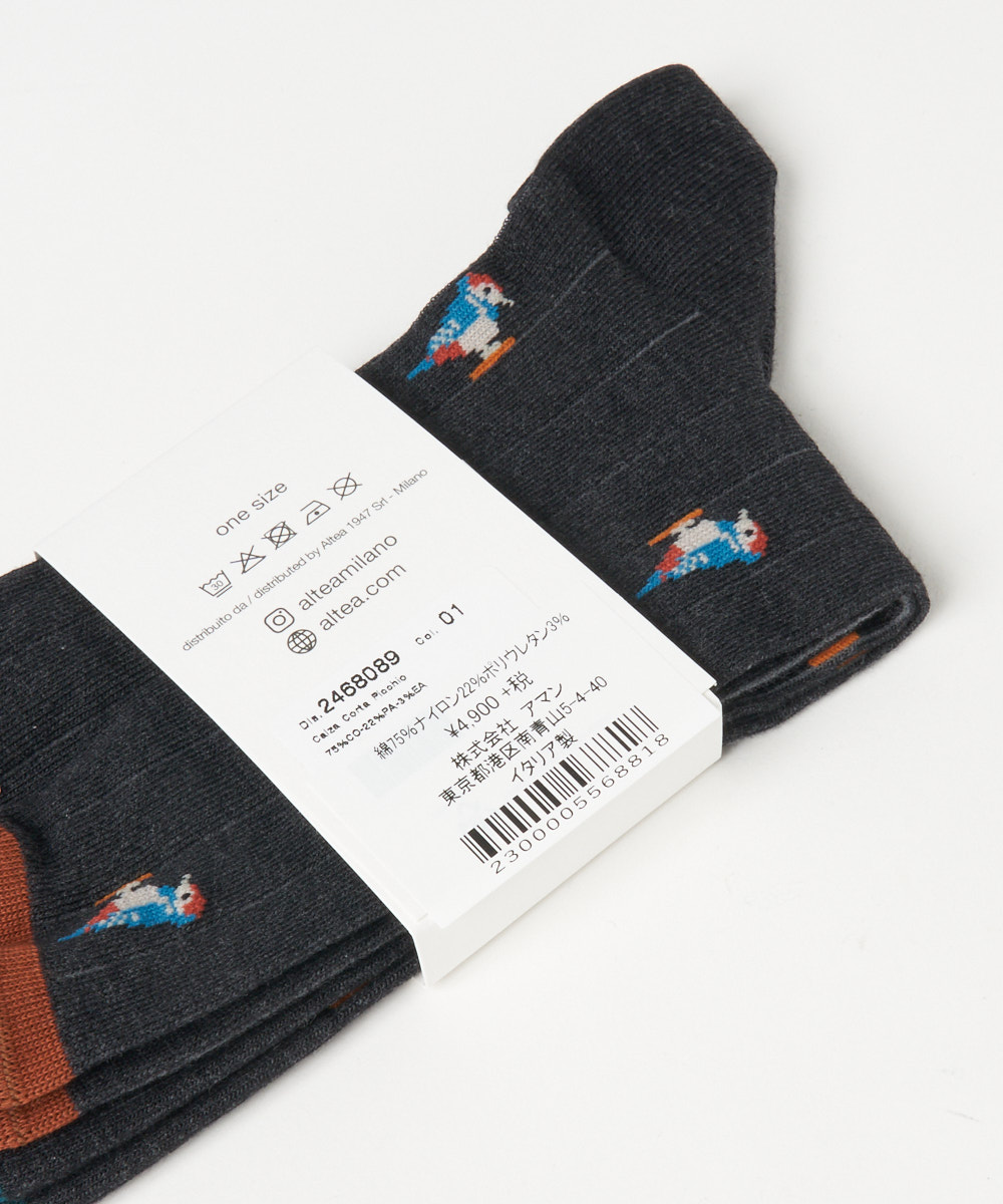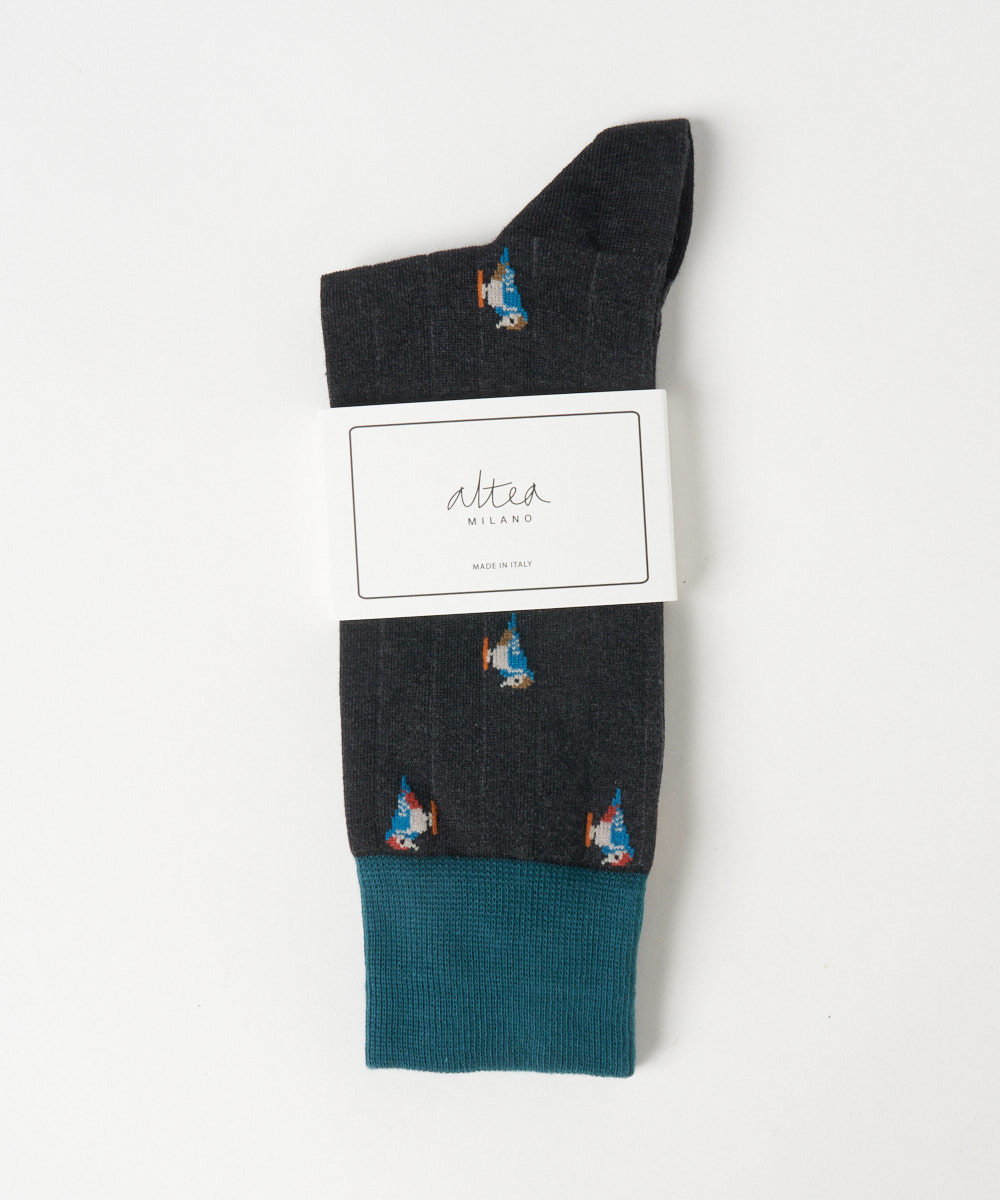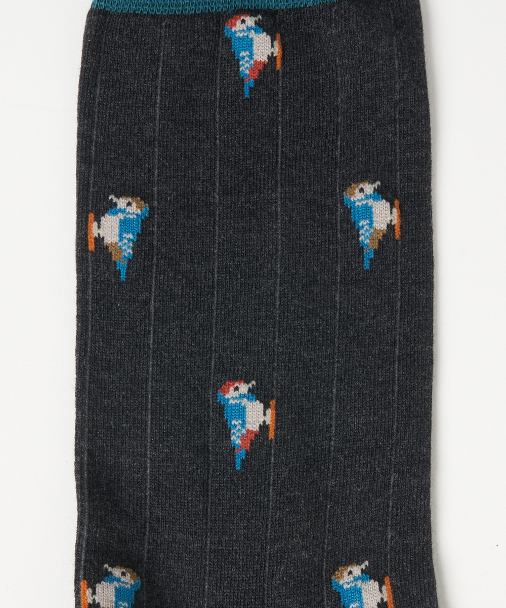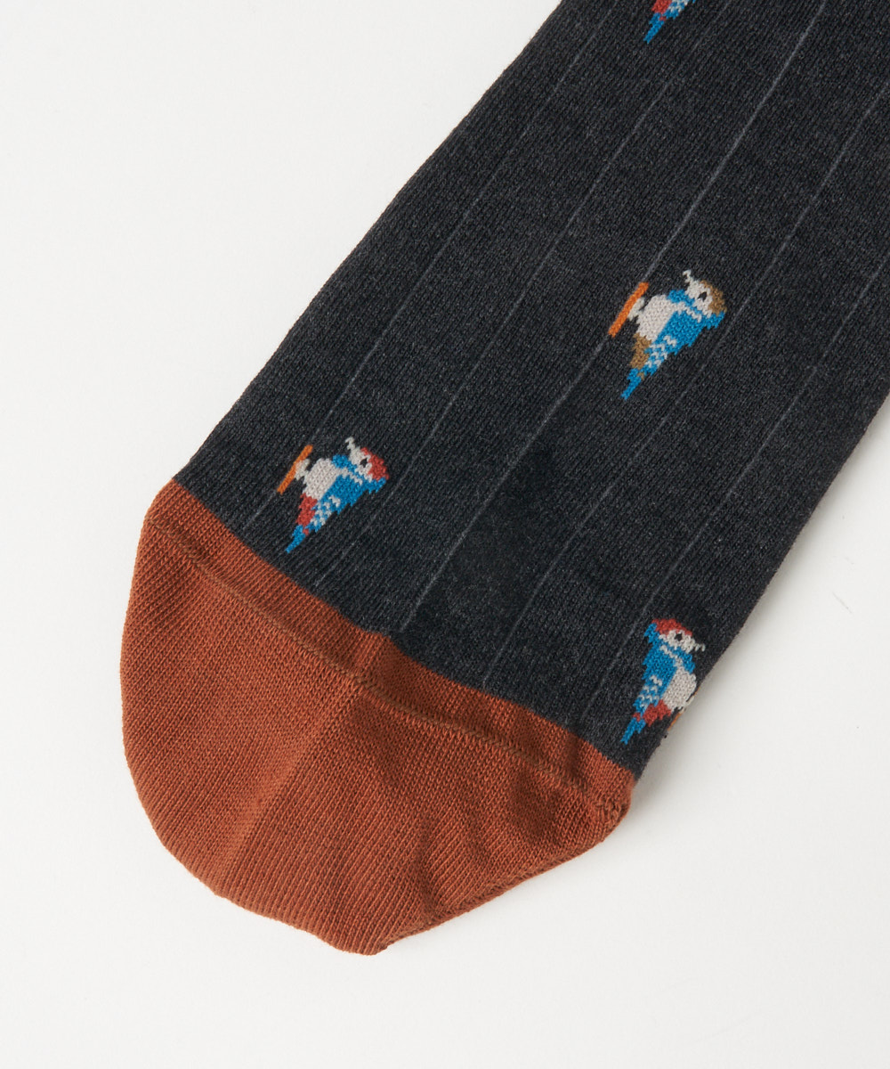 カラフルな鳥のモチーフが目を引くデザイン。鮮やかな色使いでありながらも、全体のトーンを抑えることで派手すぎず、大人のスタイリングにも自然と馴染みます。シンプルなコーディネートのアクセントとして取り入れることで、足元に程よい遊び心と華やかさをプラス。