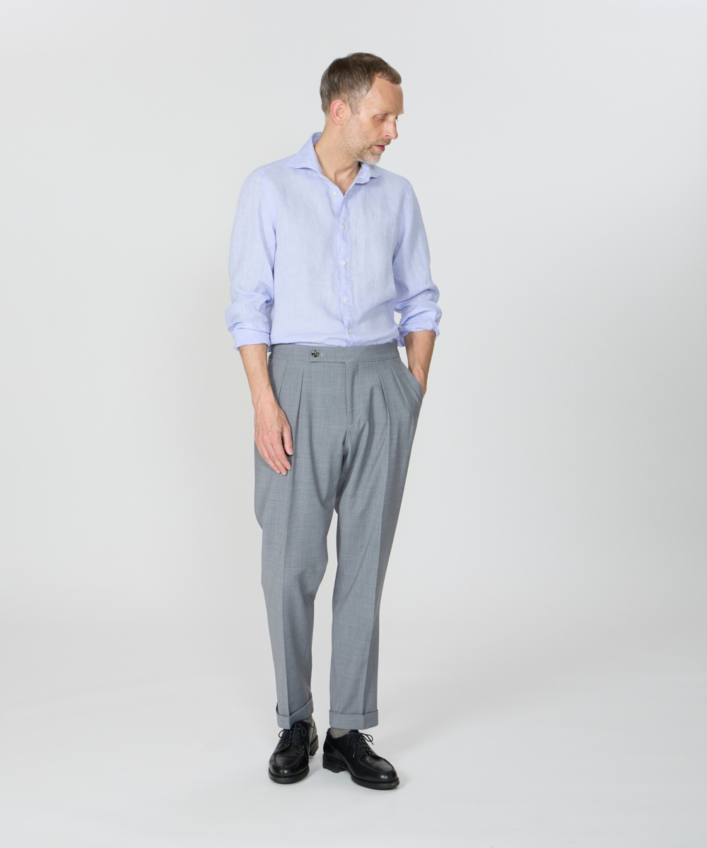袖付け・ボタン付け・ガゼット付けの3工程をハンドメイドで仕上げ、手縫いならではの柔らかな表情と、動きを妨げない独自のパターン設計により、他にはない快適な着心地を実現。肩幅は通常よりややコンパクトに設計しながら、「いせ込み」と前振りの袖付けを組み合わせることで、十分な可動域を確保しており、見た目のシャープですっきりとした印象をあたえますが、まったくストレスを感じさせない着用感が魅力です。身体に自然にフィットしつつ、程よくリラックスしたシルエットは、タックアウトでも美しく映えるよう計算されており、カジュアルからきちんと感のあるスタイリングまで幅広く対応します。