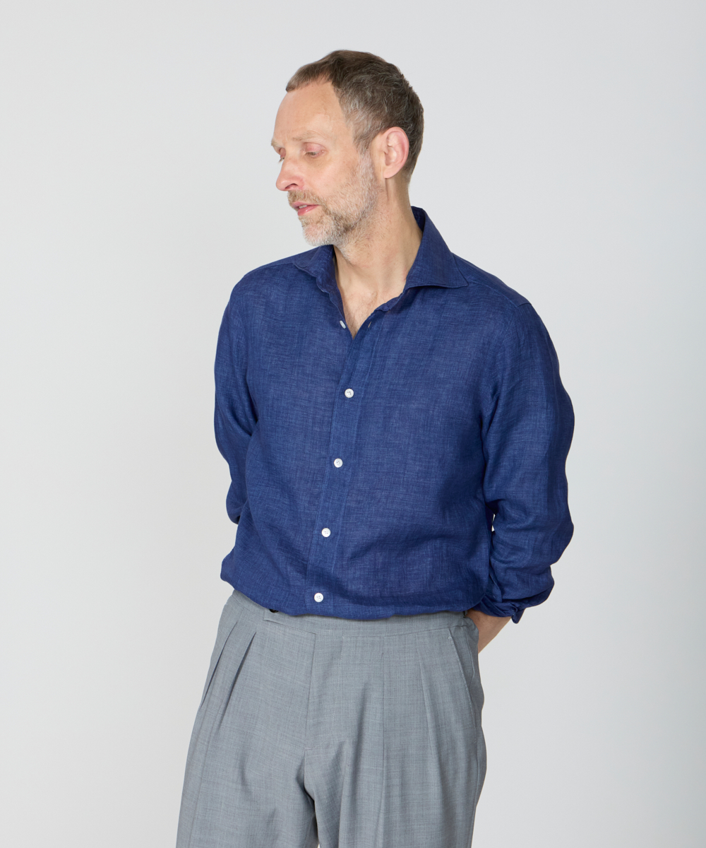 袖付け・ボタン付け・ガゼット付けの3工程をハンドメイドで仕上げ、手縫いならではの柔らかな表情と、動きを妨げない独自のパターン設計により、他にはない快適な着心地を実現。肩幅は通常よりややコンパクトに設計しながら、「いせ込み」と前振りの袖付けを組み合わせることで、十分な可動域を確保しており、見た目のシャープですっきりとした印象をあたえますが、まったくストレスを感じさせない着用感が魅力です。身体に自然にフィットしつつ、程よくリラックスしたシルエットは、タックアウトでも美しく映えるよう計算されており、カジュアルからきちんと感のあるスタイリングまで幅広く対応します。