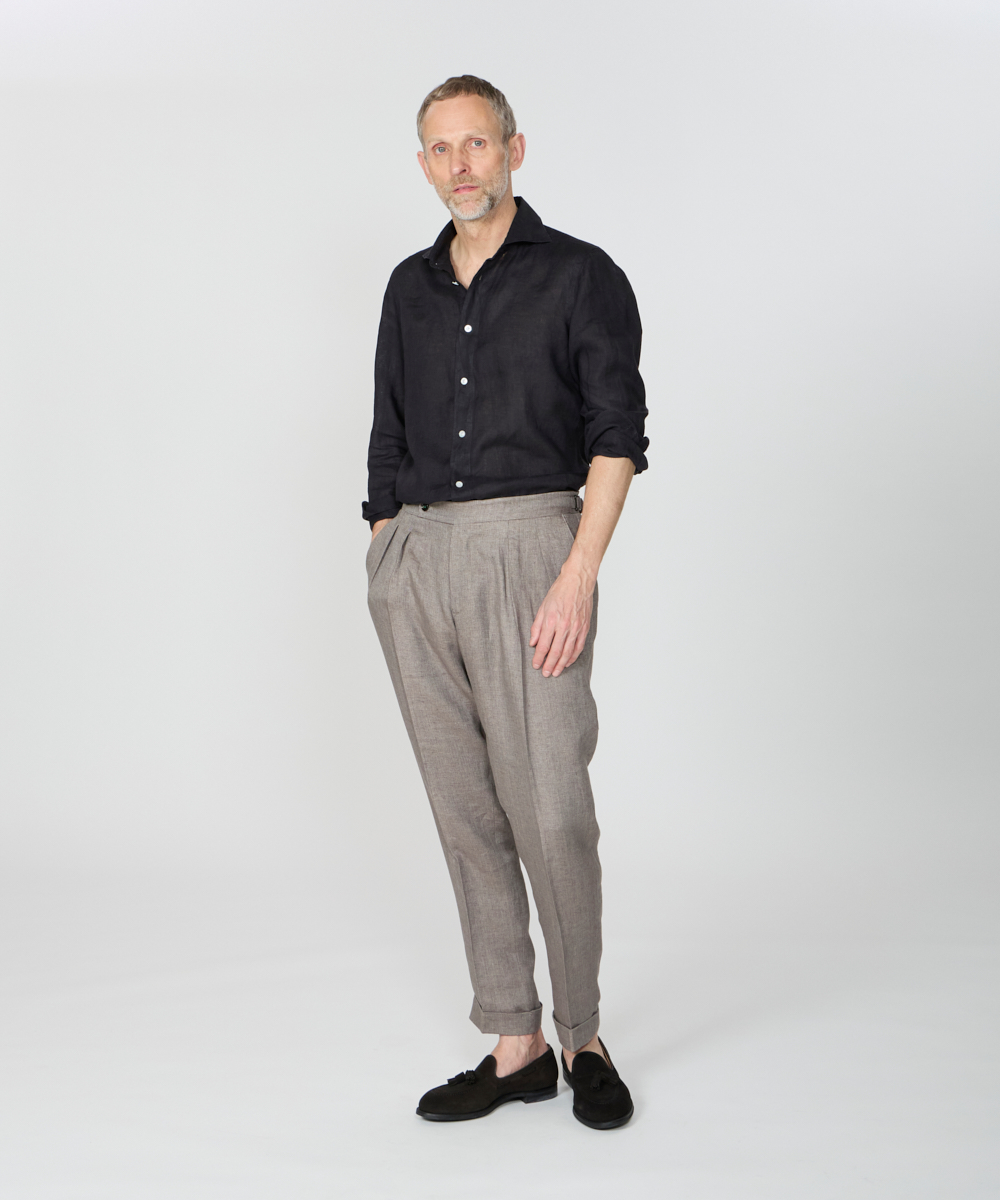 夏には欠かせないリネンファブリックを採用。リネンならではの高い通気性と吸湿性により、熱がこもりにくく、快適な着心地を保ちます。リネン特有のさりげないシワ感が生み出す表情は、かっちりしすぎない抜け感を演出。着込むほどに柔らかさが増し、身体に馴染むリネンの経年変化は、大人のカジュアルスタイルにさりげない品格をもたらします。