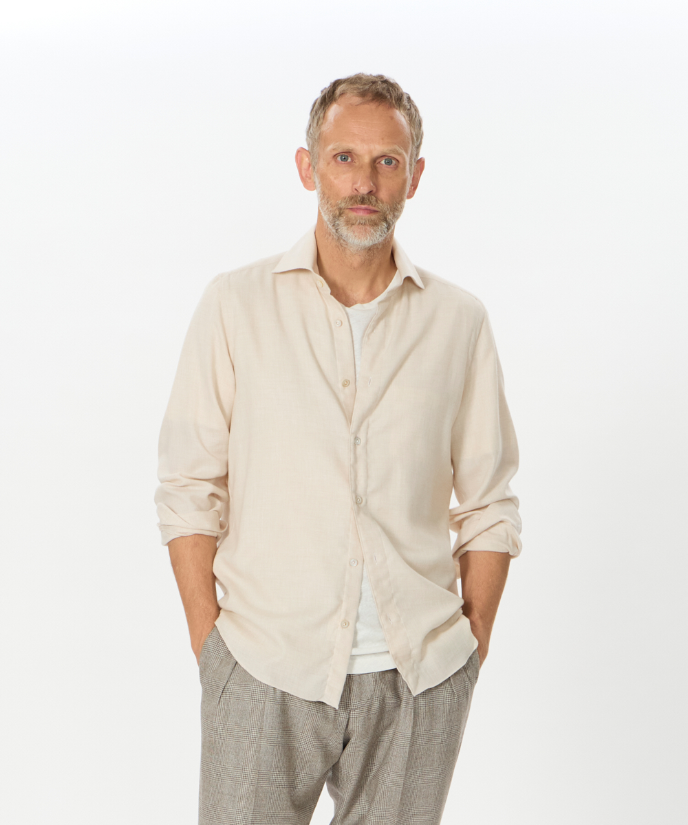 生地には、英国の名門・トーマス メイソン社のカシミアコットンを採用。カシミア混ならではの柔らかさと温かみ、上品な光沢感が特徴で、秋冬シーズンにふさわしい贅沢な一枚です。温もりある色味と肌触りの良い素材感は、着る人の印象を上品に引き立て、大人の装いを格上げしてくれます。Finamoreが誇る伝統と技術が詰まったシャツを、ぜひお試しください。