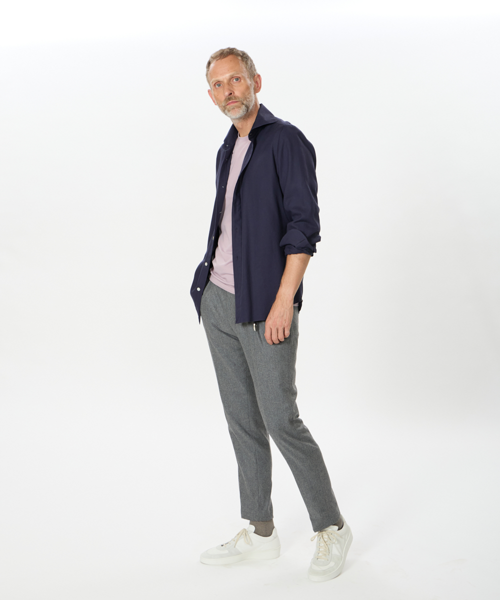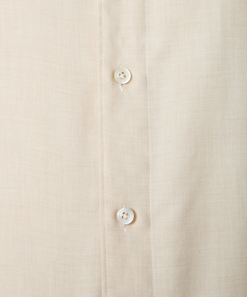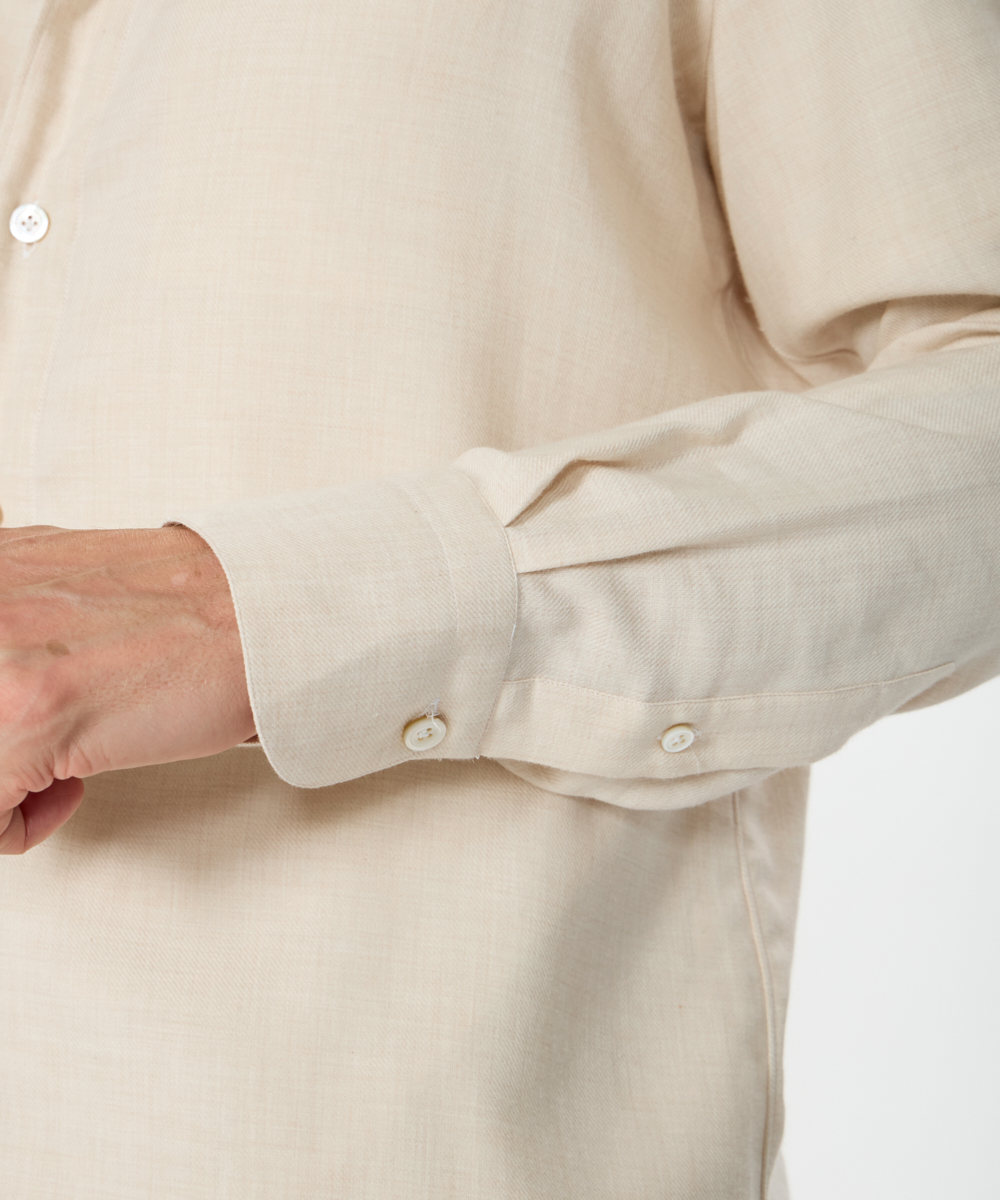 襟型「PANTELLERIA(パンテレリア)」は、台襟から襟までを一枚の生地で構成したワンピースカラー仕様。首元に自然な立体感と美しいロールを生み出し、Finamoreならではの高い縫製技術が際立つデザインです。スポーツラインに分類される本モデルは、袖付け・ボタン付け・ガゼット付けの3工程をハンドメイドで仕上げています。手作業ならではの柔らかな表情や自然なフィット感が魅力で、Finamore独自のパターン設計が、動きを妨げず快適な着心地を実現します。
