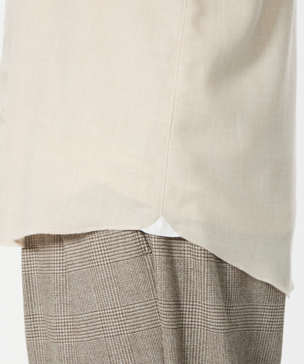ボディは適度にリラックスしたシルエットで、タックアウトでもバランス良く着られるよう、丈感が細かく計算されたデザイン。シャツ一枚での着用はもちろん、羽織りものとの相性も抜群です。