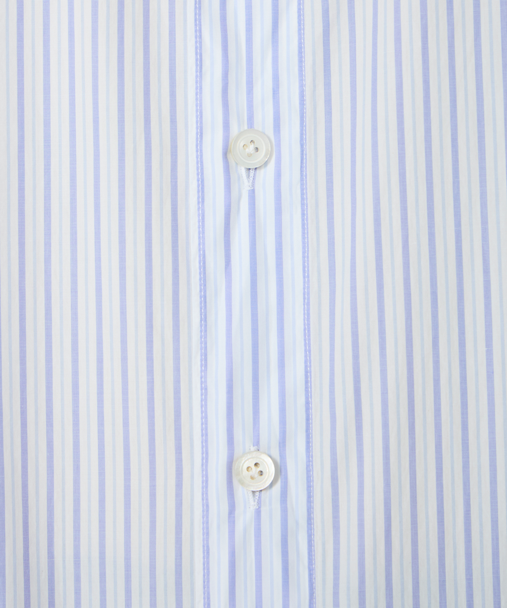 生地には、鮮やかなブルーのストライプが目を引くコットンファブリックを採用。上品で清潔感のある配色が、シンプルになりがちなシャツスタイルにワンポイントの華やかさを添え、大人の装いを格上げしてくれます。