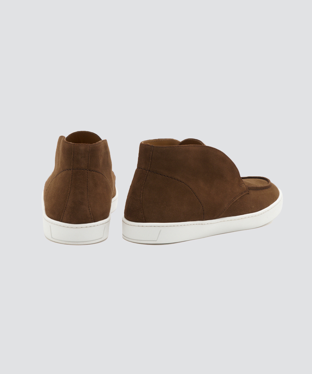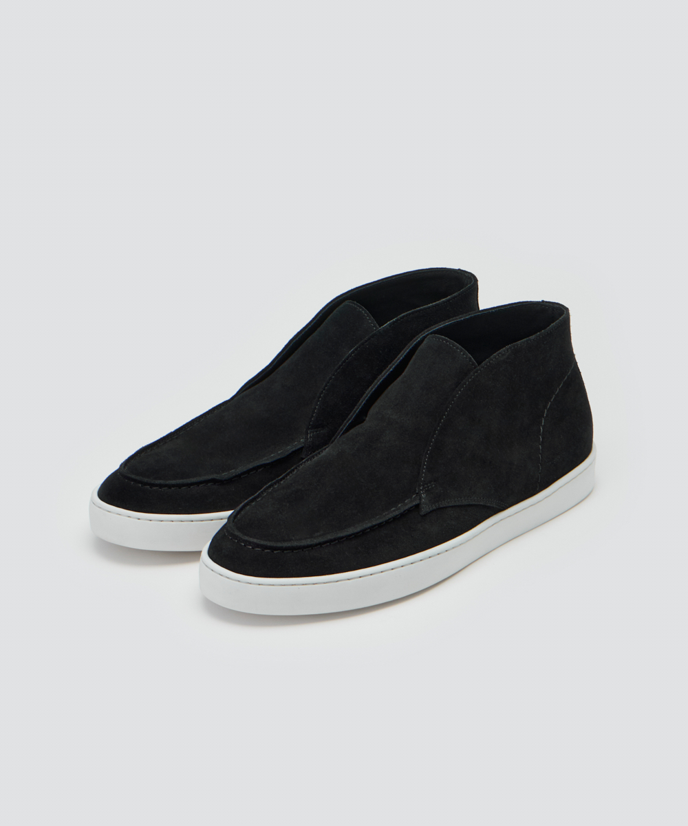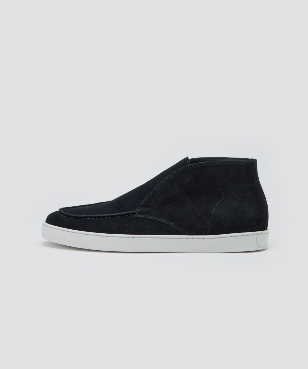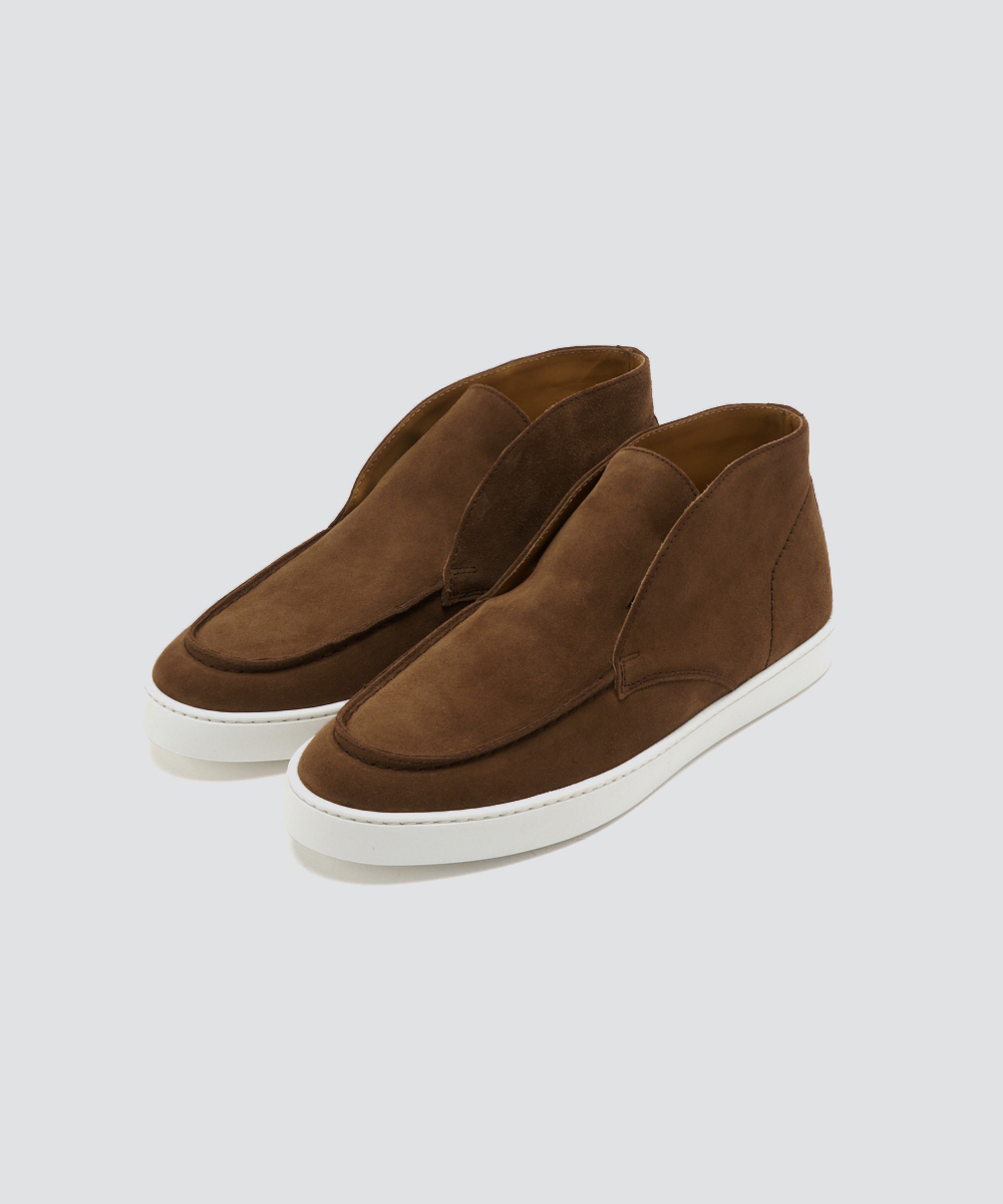 上質な素材と仕立てで、短めの毛足が揃った滑らかな牛革スウェードを使用。薄手ながらコシがあり、履き始めから柔らかく馴染みます。ソールは約2cm厚でクッション性が高く、疲れにくく快適。軽やかさと上品な華やかさを両立しています。ハイカットデザインで、クラシカルかつ現代的な印象に。足元に上品なアクセントを添え、コーディネートを格上げします。