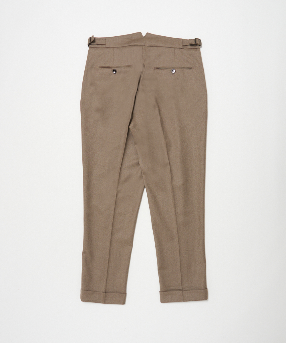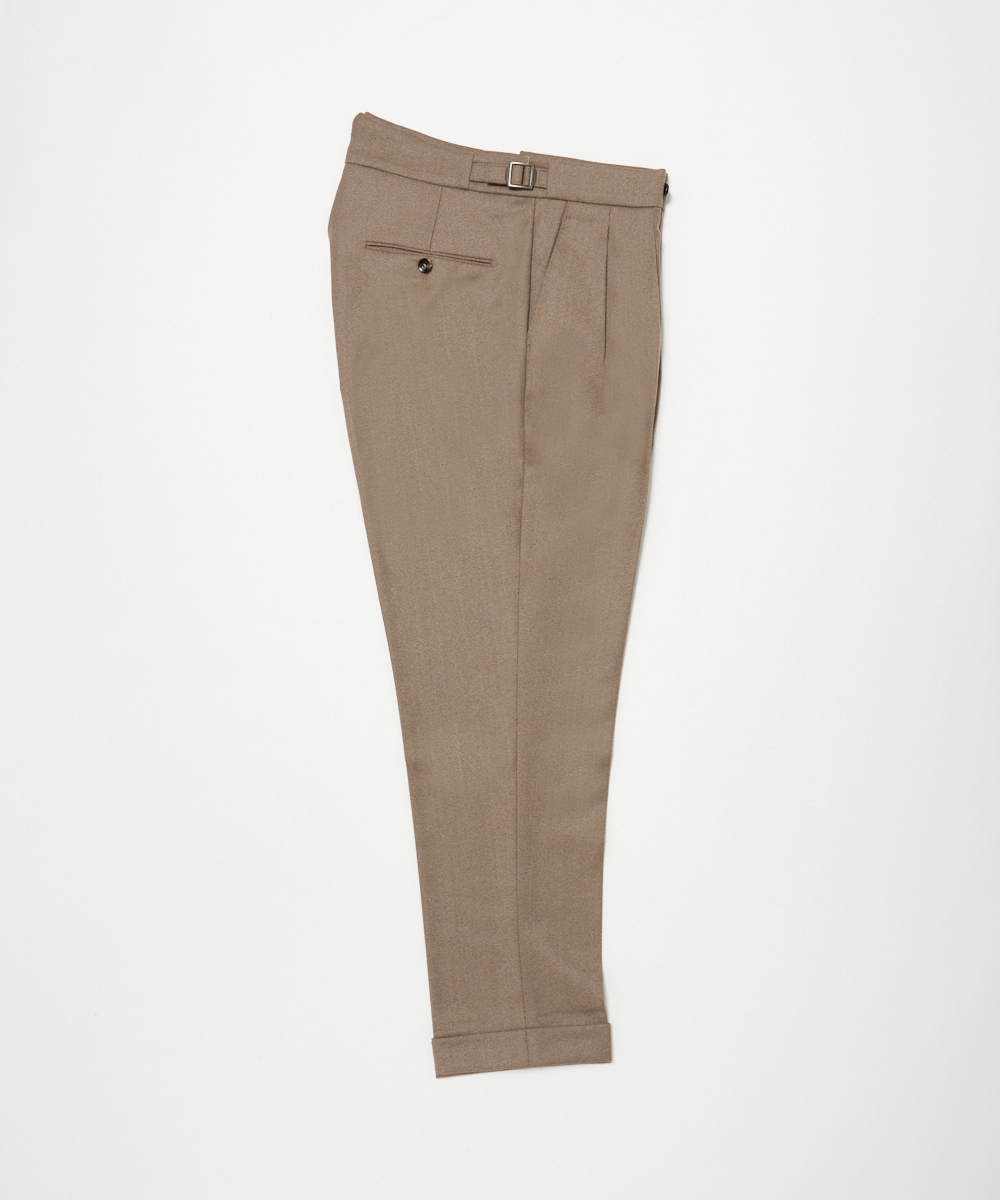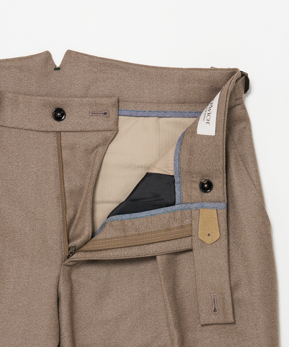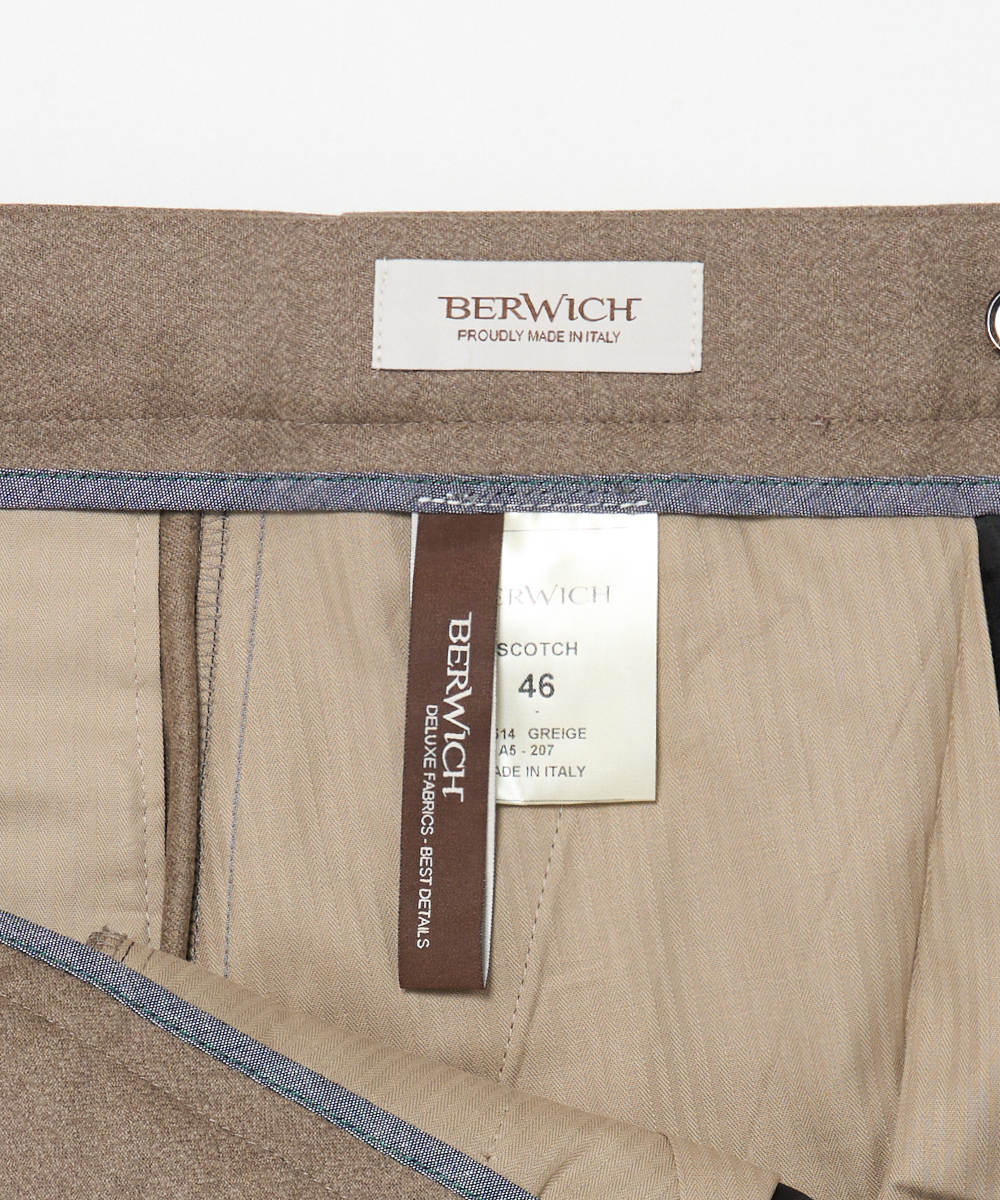 BERWICHを代表するモデル"SCOTCH(スコッチ)”は、2プリーツが入りサイドアジャスターが付くクラシカルな仕様で、ゆったりとした腰回りと裾口にかけての美しいテーパードが目を惹くモダンクラシックな表情が特徴のモデル。