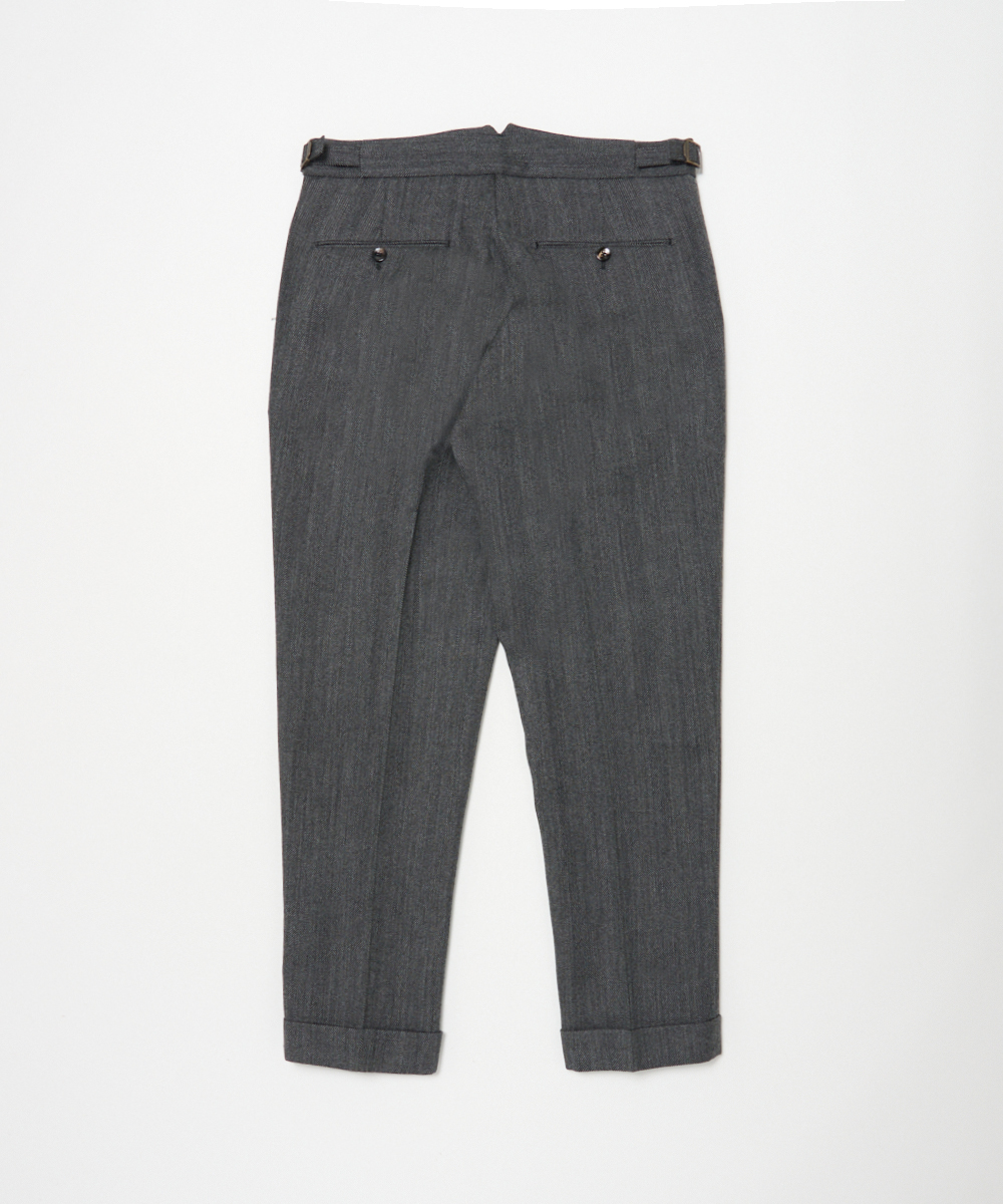 BERWICHを代表するモデル"SCOTCH(スコッチ)”は、2プリーツが入りサイドアジャスターが付くクラシカルな仕様で、ゆったりとした腰回りと裾口にかけての美しいテーパードが目を惹くモダンクラシックな表情が特徴のモデル。