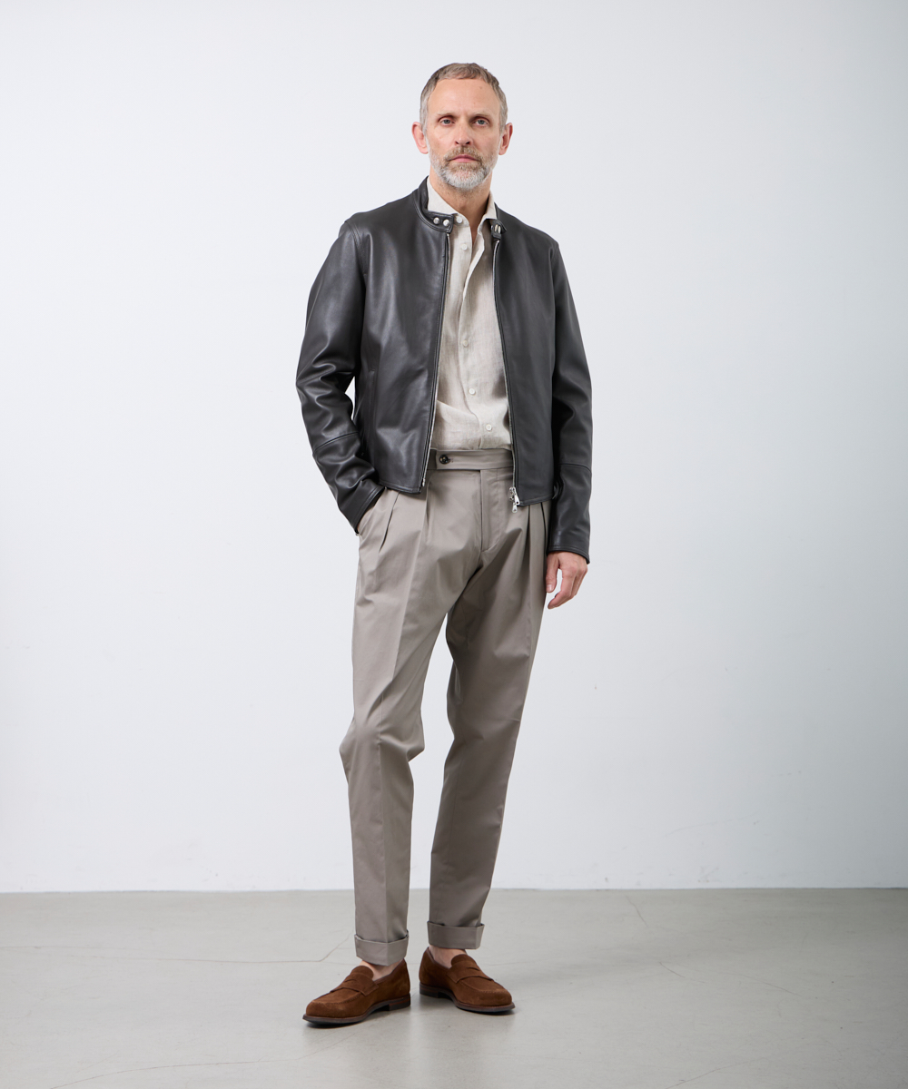 サイドアジャスター付きのクラシカルな仕様が魅力。腰回りはゆったりとしたシルエットながら、裾に向かって美しくテーパードがかかっており、さらに2プリーツを施すことで、ほどよく引き締まり、クラシックながらモダンな印象を演出します。