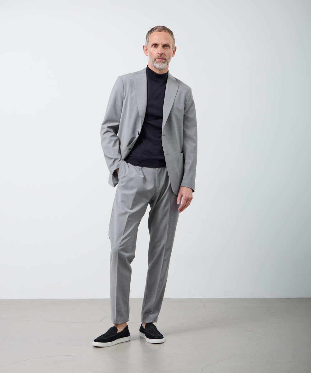 パンツはワンプリーツ仕様に加え、ウエストシャーリング加工とドローコードを採用。スーツでありながら、リラックス感があり、思わず手に取りたくなるような、穿き心地を実現しています。