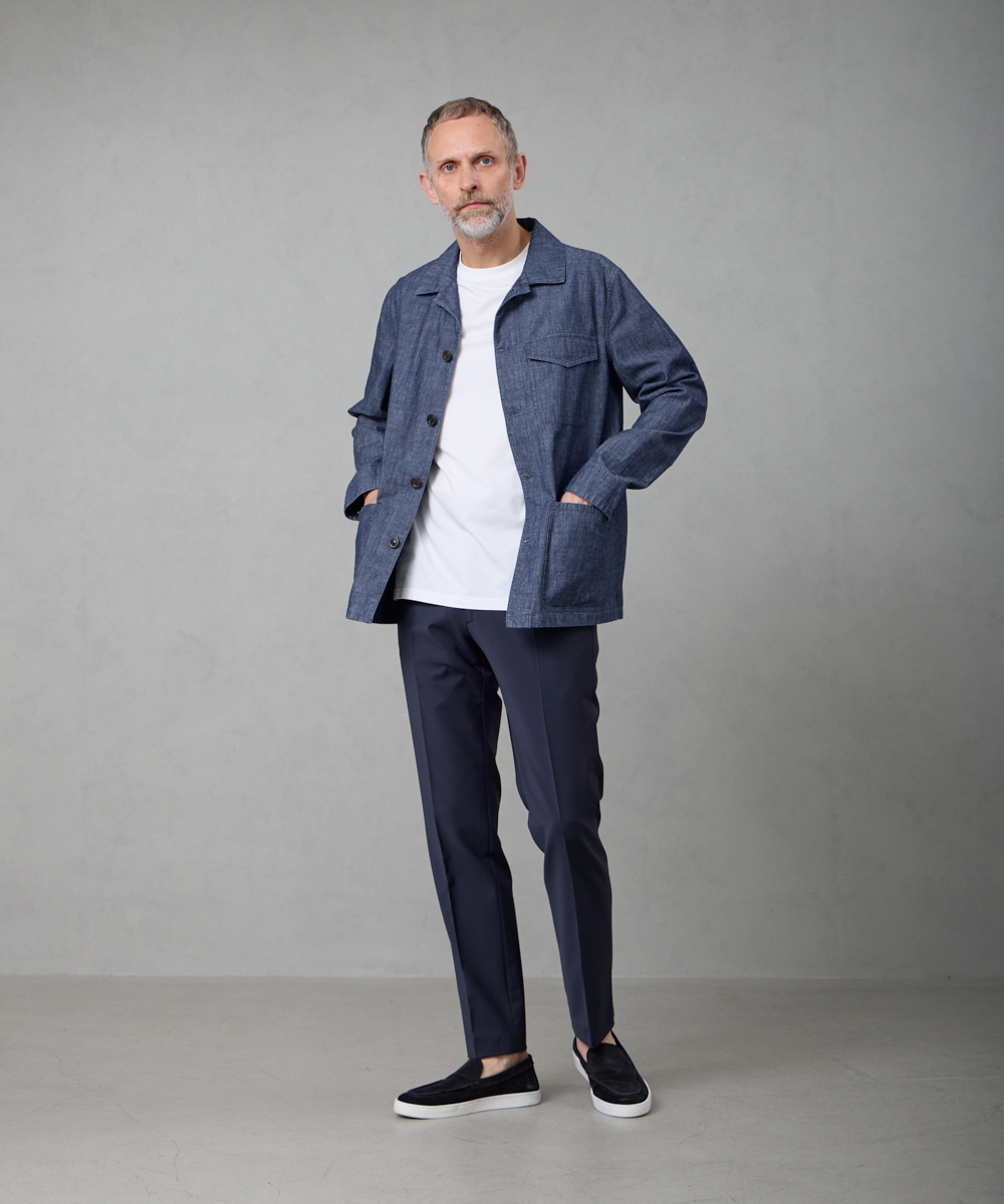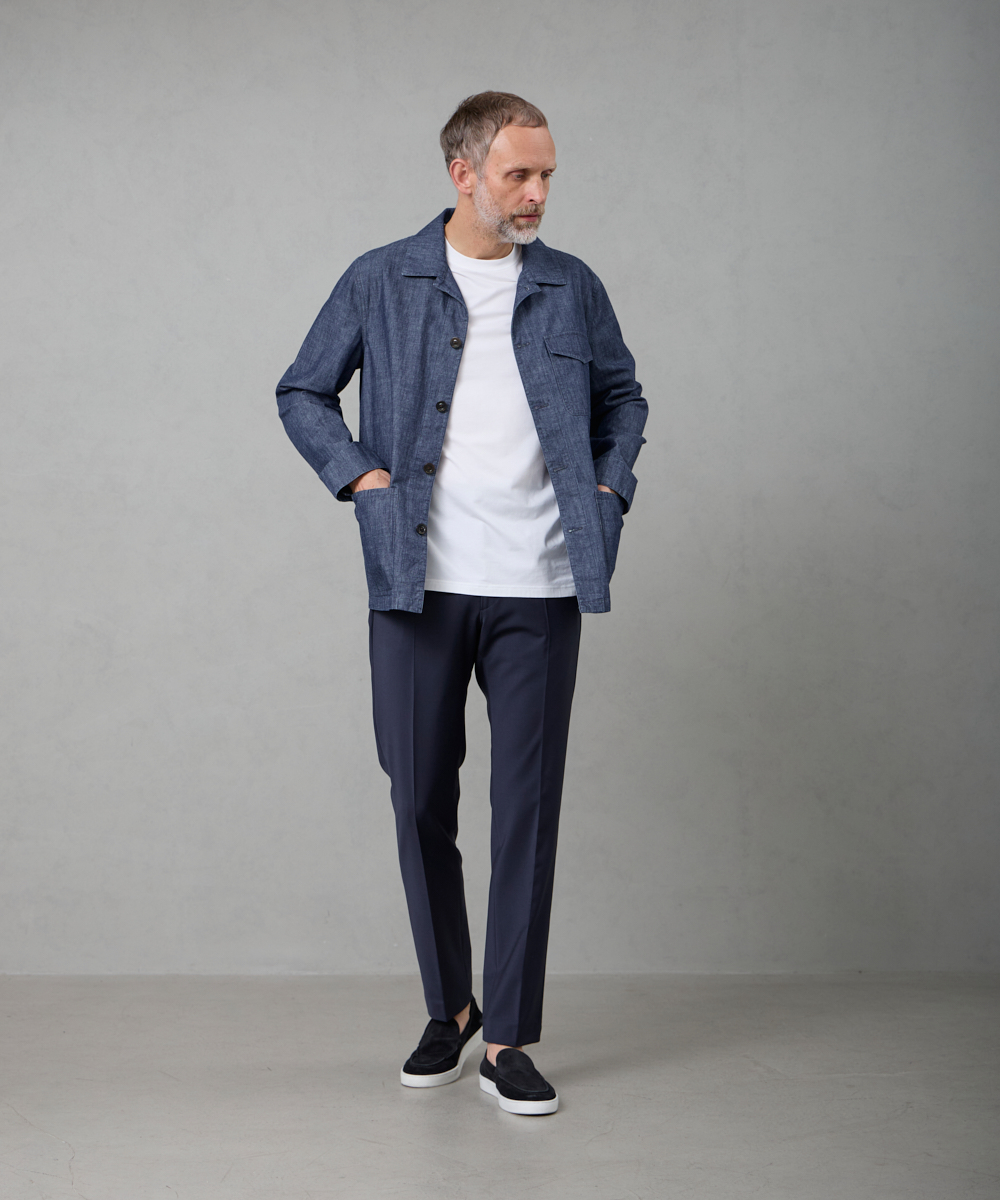素材にはコットン100%を採用。ワークウェアらしいタフな表情を持ちながらも、柔らかい肌触りとBOGLIOLIのテーラリング技術により、快適な着心地を実現しています。胸元と裾付近に配されたポケットは、ワークウェア由来の実用性を感じさせる魅力の一つ。デザインのアクセントとしても機能し、程よくカジュアルな表情をプラスします。オーバーサイズすぎないシルエットは、ジャケット感覚で羽織ることができ、シャツやカットソーの上からはもちろん、オフィスカジュアルから休日スタイルまで幅広く対応できます。
