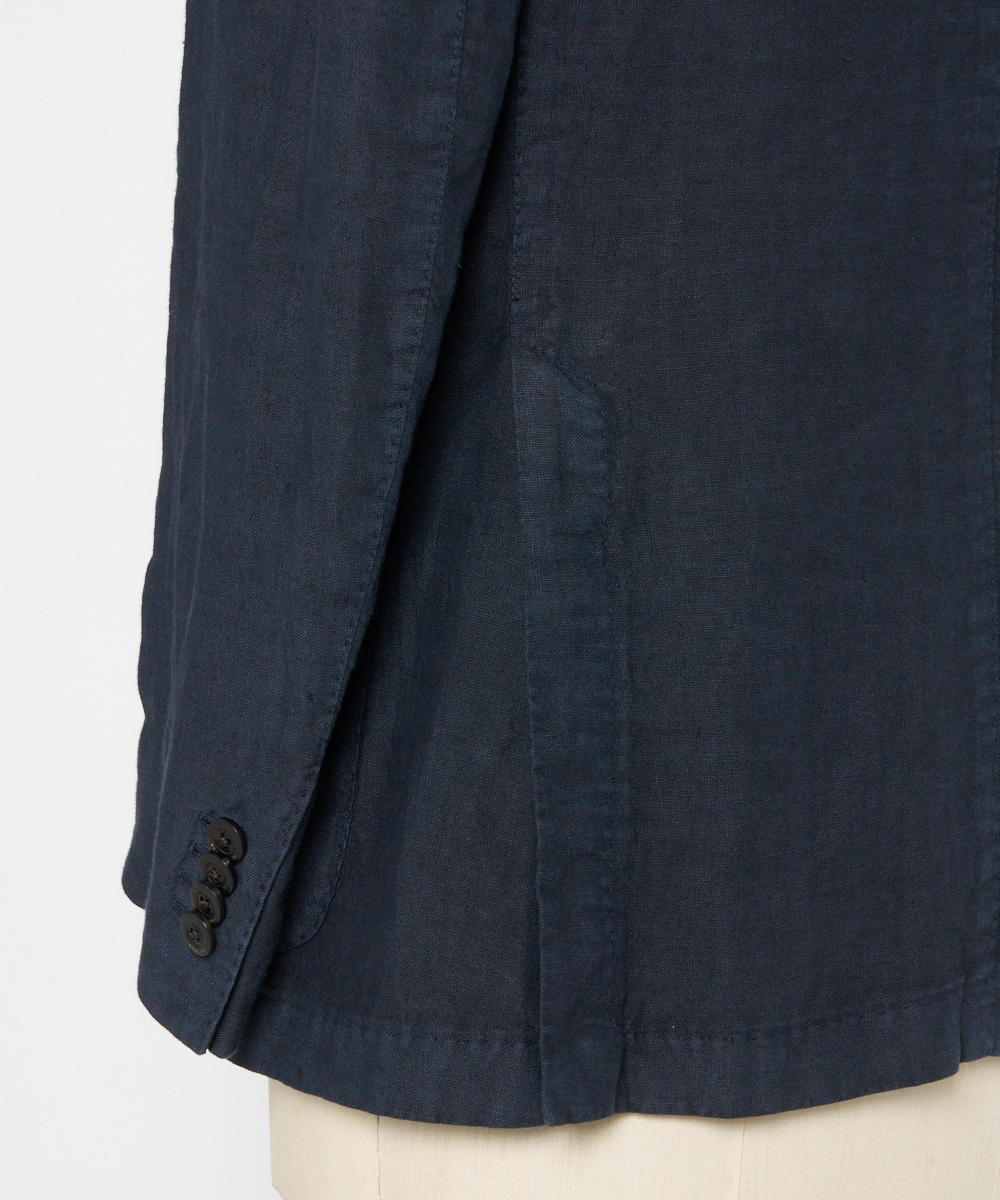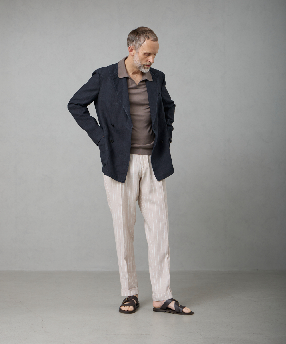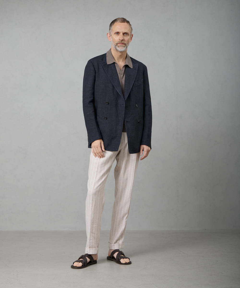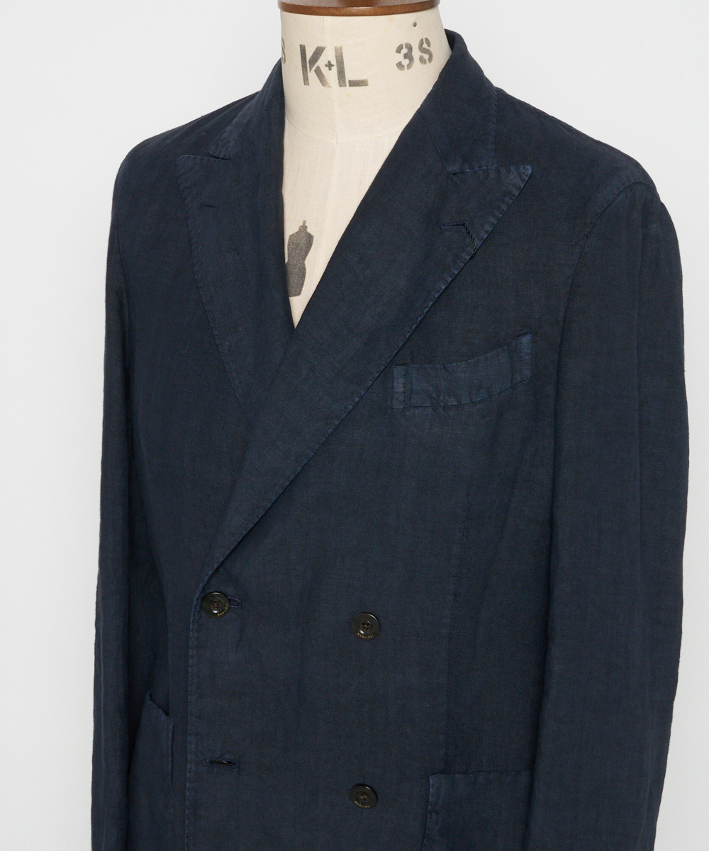 リネン100%の生地にガーメントダイを施し、春夏らしい軽やかな表情に。4B仕様のダブルジャケットでありながら、かしこまりすぎることなく、程よくカジュアルダウンした雰囲気のある一着に仕上げています。スラックスやデニムなど、幅広いスタイリングに取り入れやすいのもポイント。この春夏のコーディネートの幅を広げてくれます。