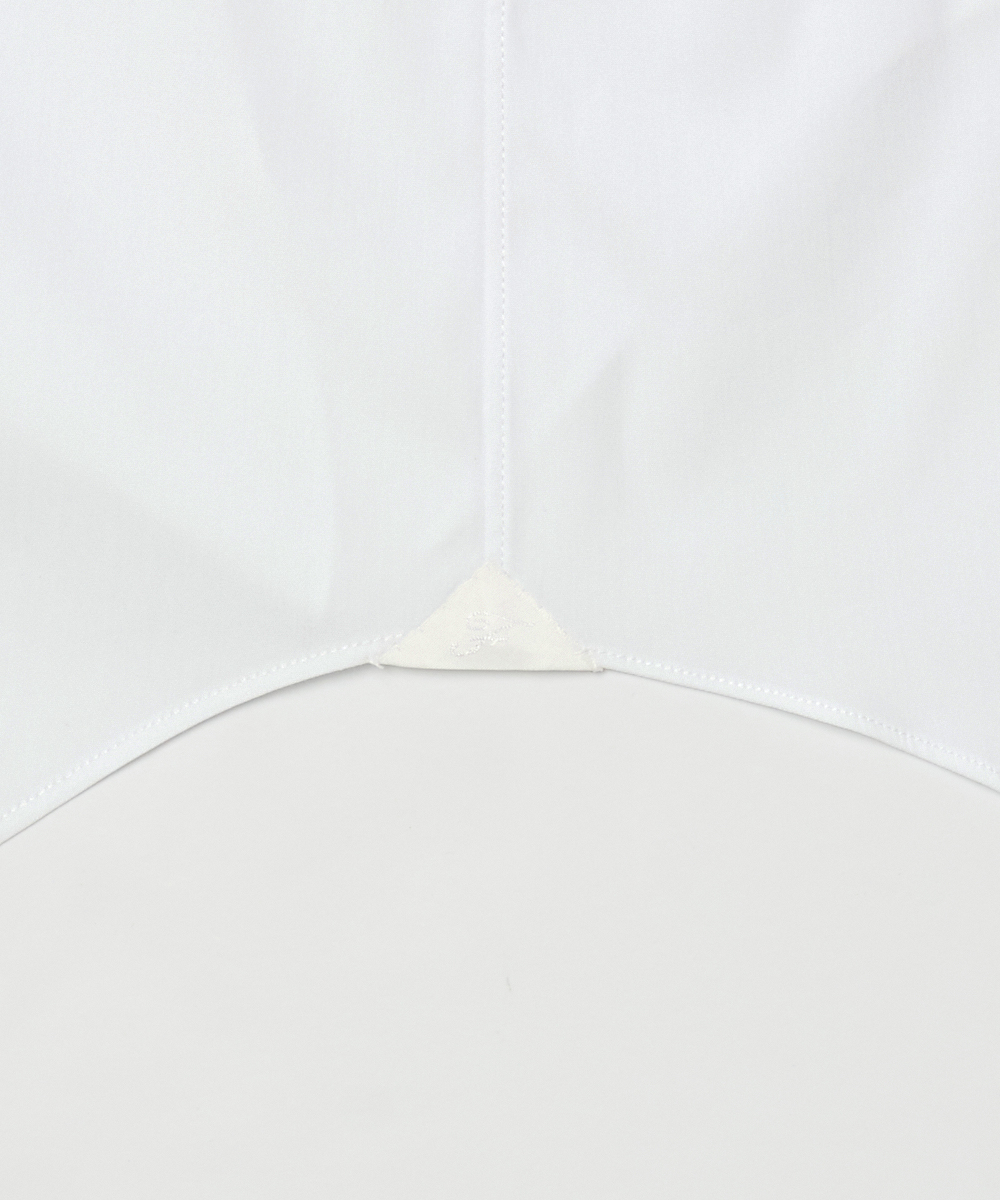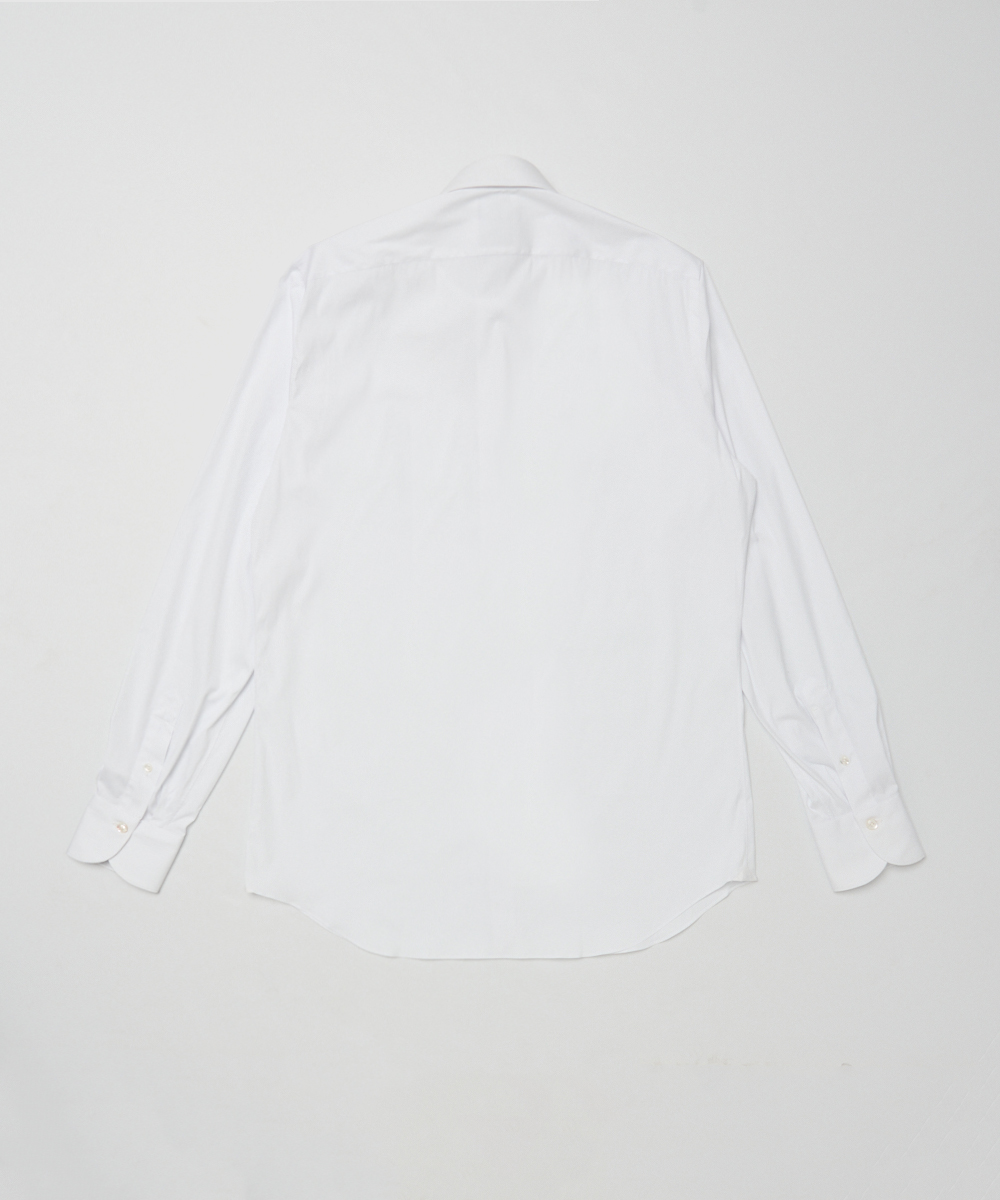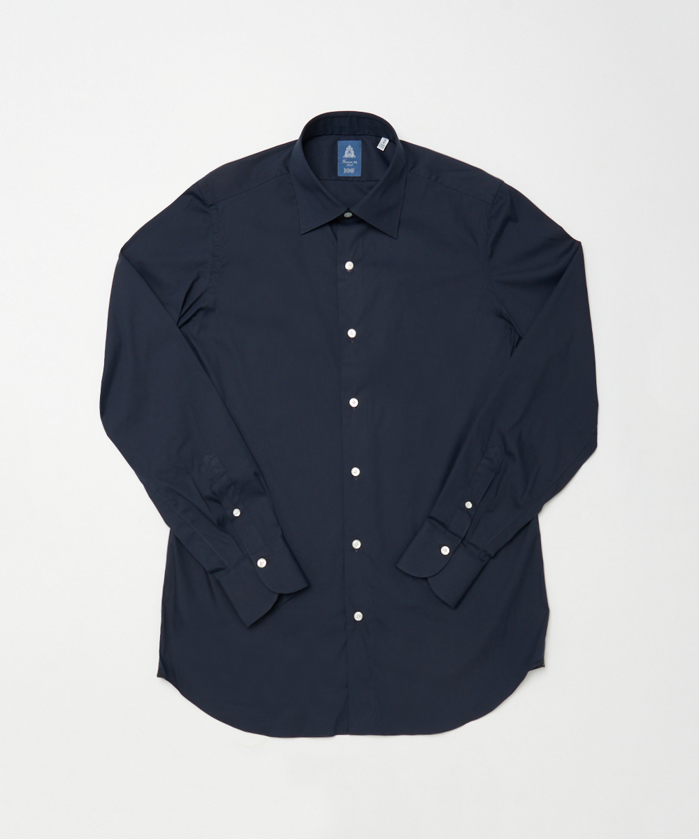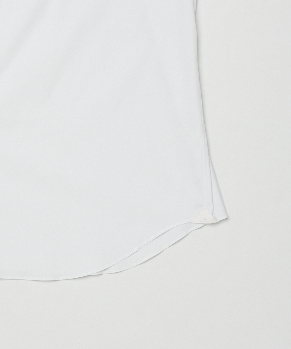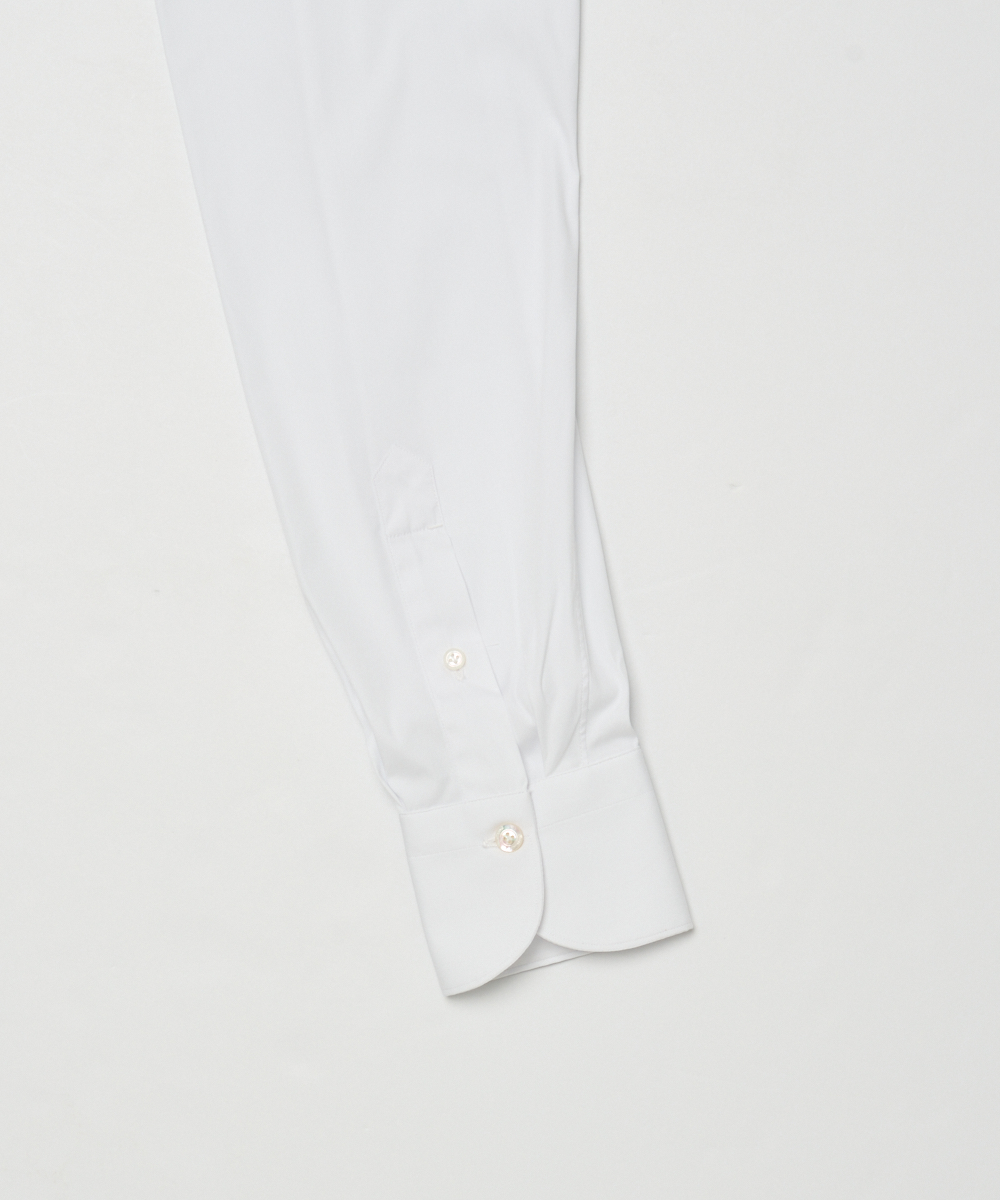 ポプリン採用。襟型はセミワイドカラーで、首まわりをすっきり見せつつネクタイの有無を問わず着用可能です。