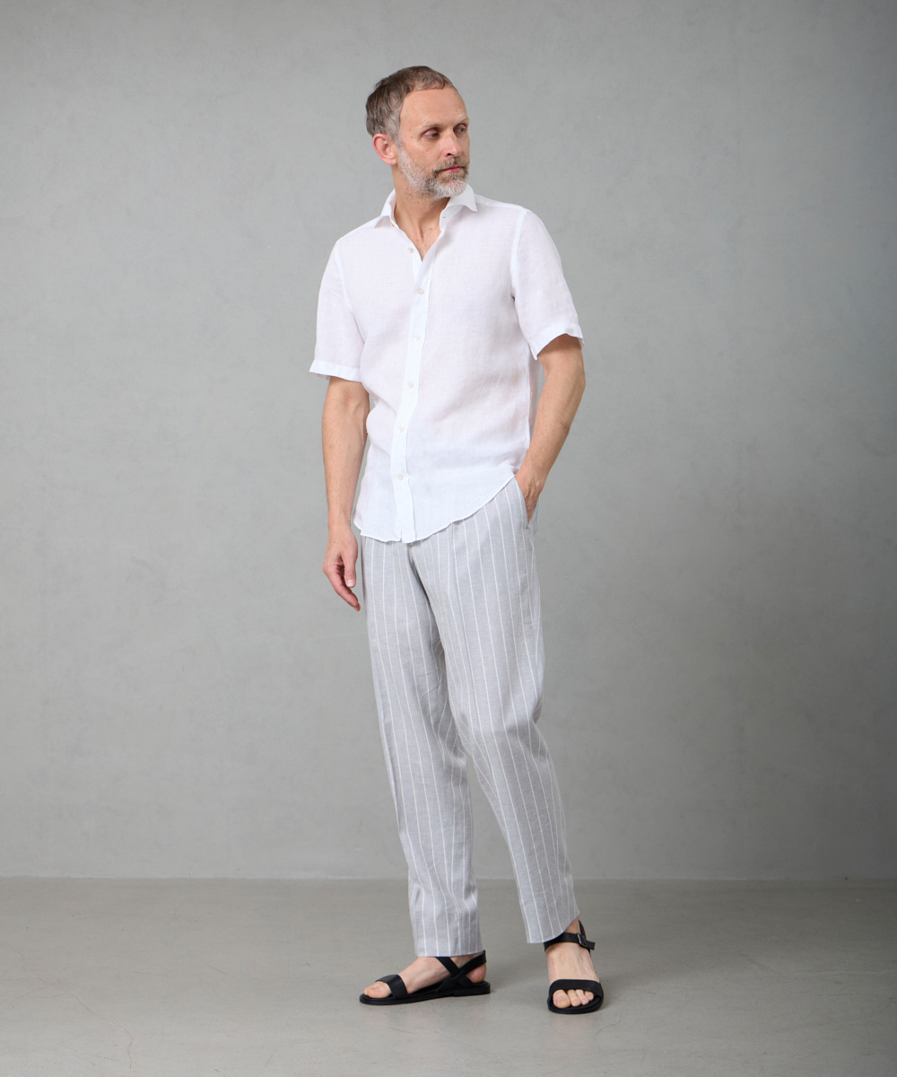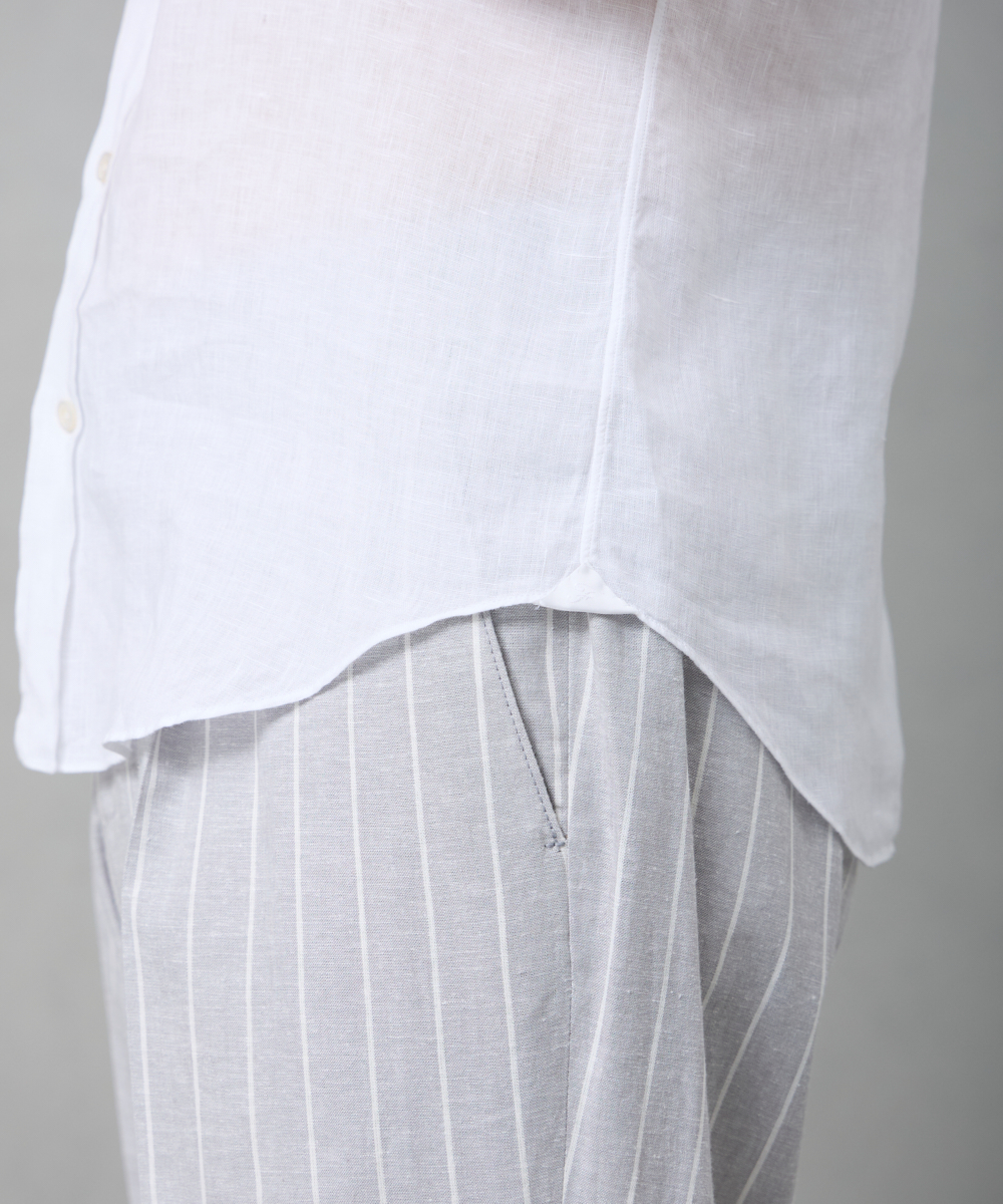 夏には欠かせないリネンファブリックを採用。リネンならではの高い通気性と吸湿性により、熱がこもりにくく、快適な着心地を保ちます。リネン特有のさりげないシワ感が生み出す。
