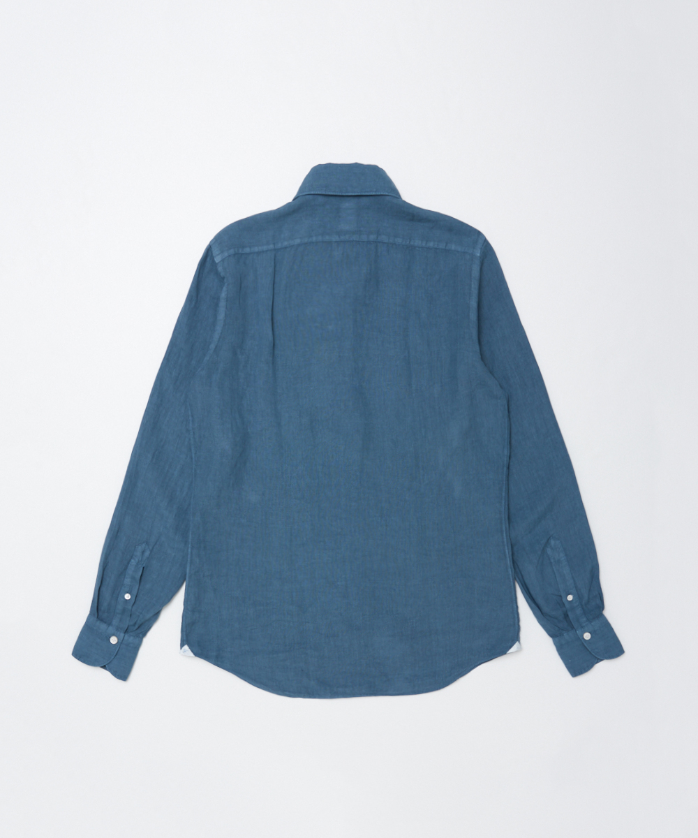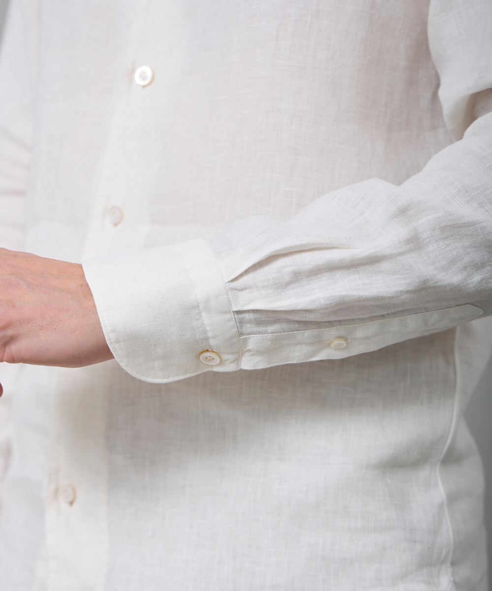袖付け・ボタン付け・ガゼット付けの3工程をハンドメイドで仕上げ、手縫いならではの柔らかな表情と、動きを妨げない独自のパターン設計により、他にはない快適な着心地を実現。肩幅は通常よりややコンパクトに設計しながら、「いせ込み」と前振りの袖付けを組み合わせることで、十分な可動域を確保しており、見た目のシャープですっきりとした印象をあたえますが、まったくストレスを感じさせない着用感が魅力です。身体に自然にフィットしつつ、程よくリラックスしたシルエットは、タックアウトでも美しく映えるよう計算されており、カジュアルからきちんと感のあるスタイリングまで幅広く対応します。
