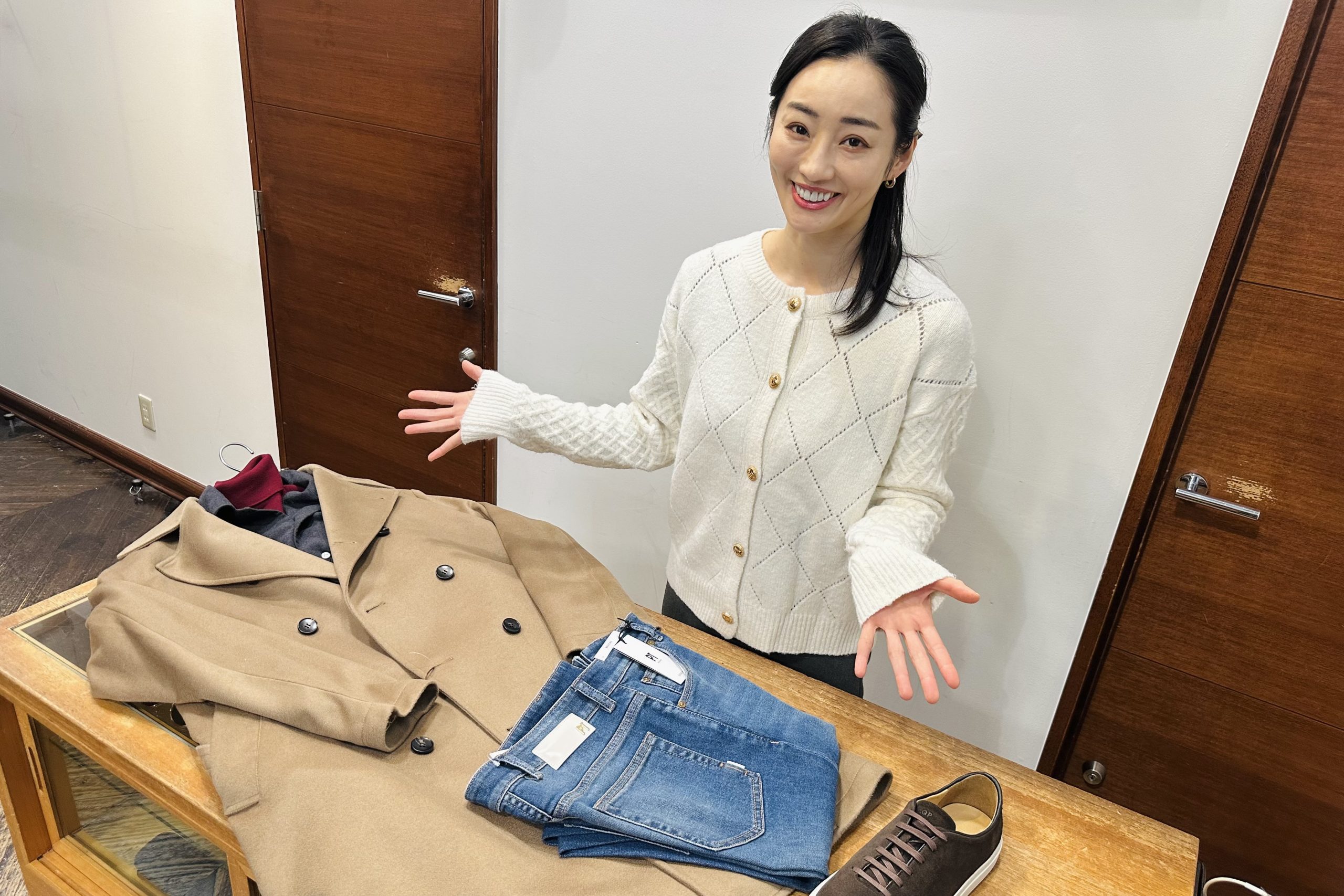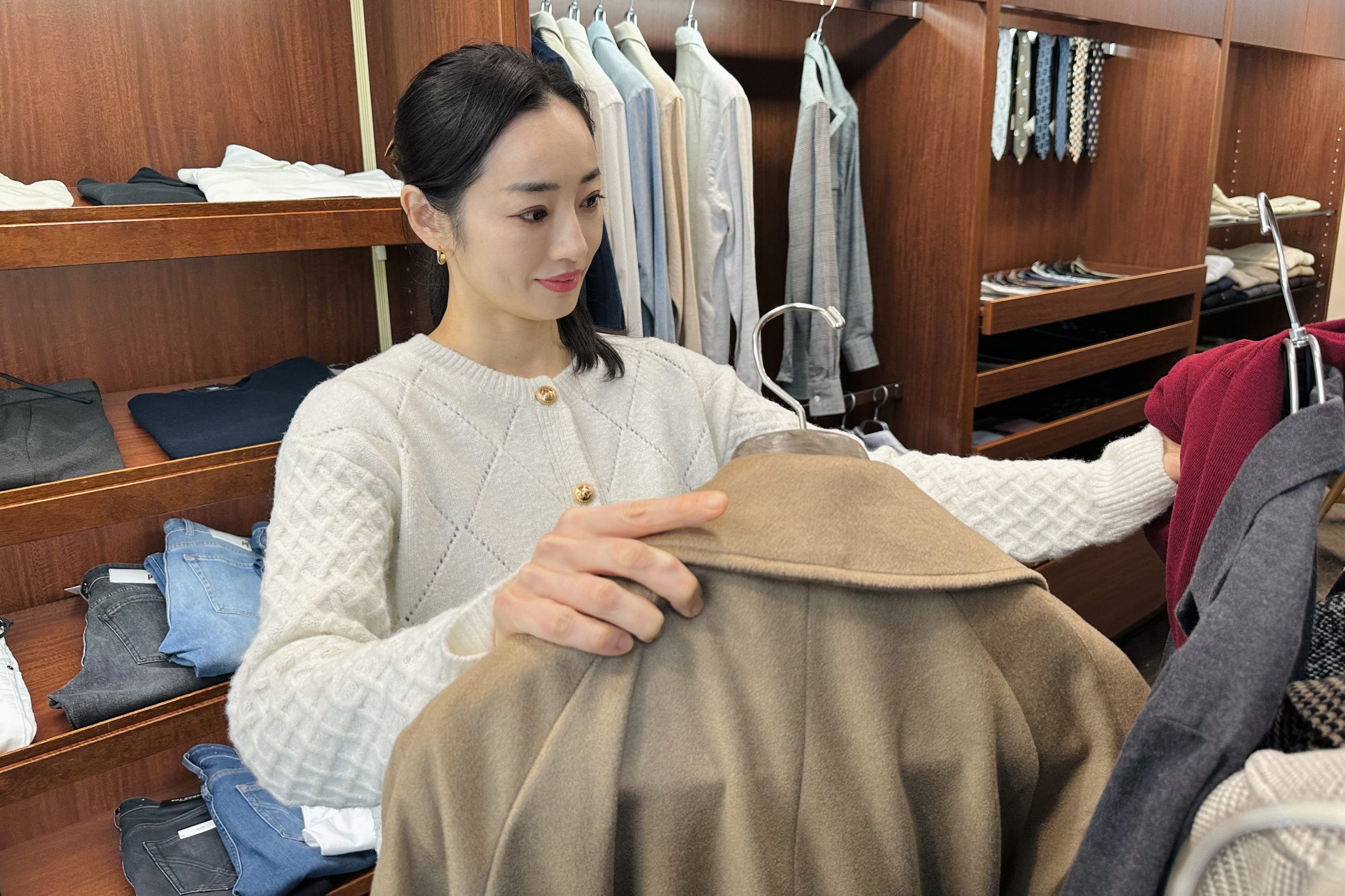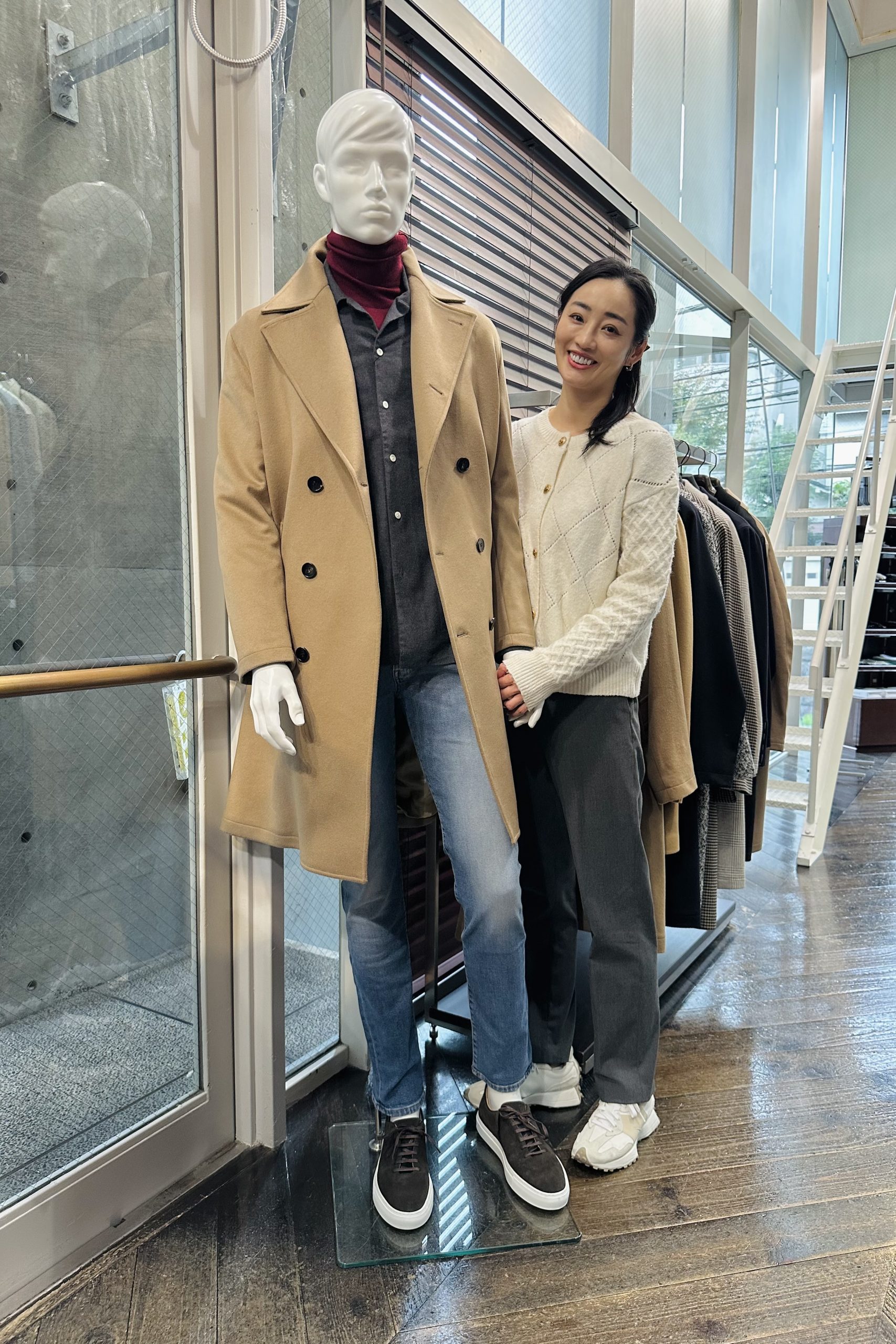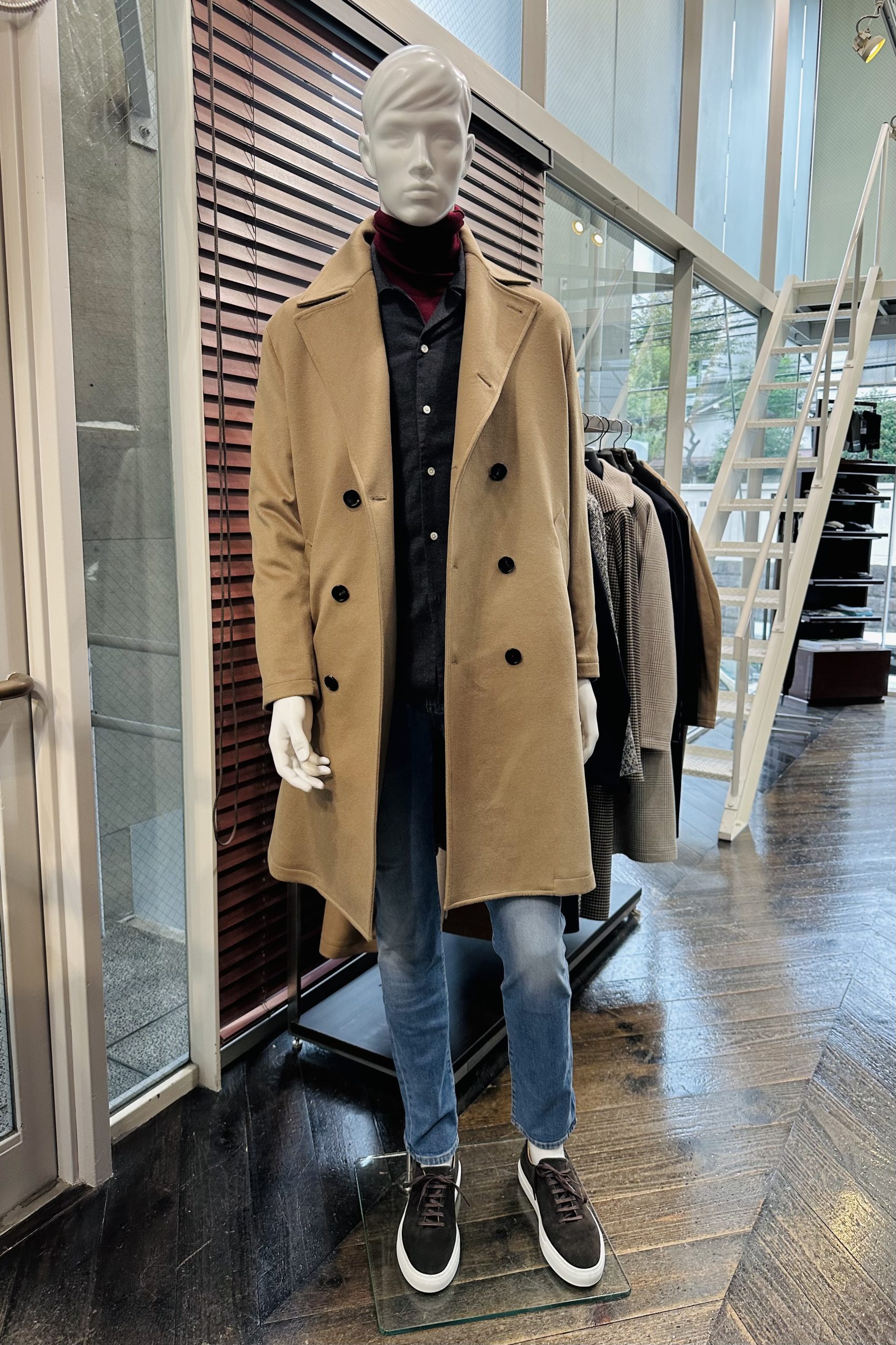 パッと目を引く高級感漂うカシミアコート。美しいシルエットと色合いが魅力的なこちらのコートをチョイス。