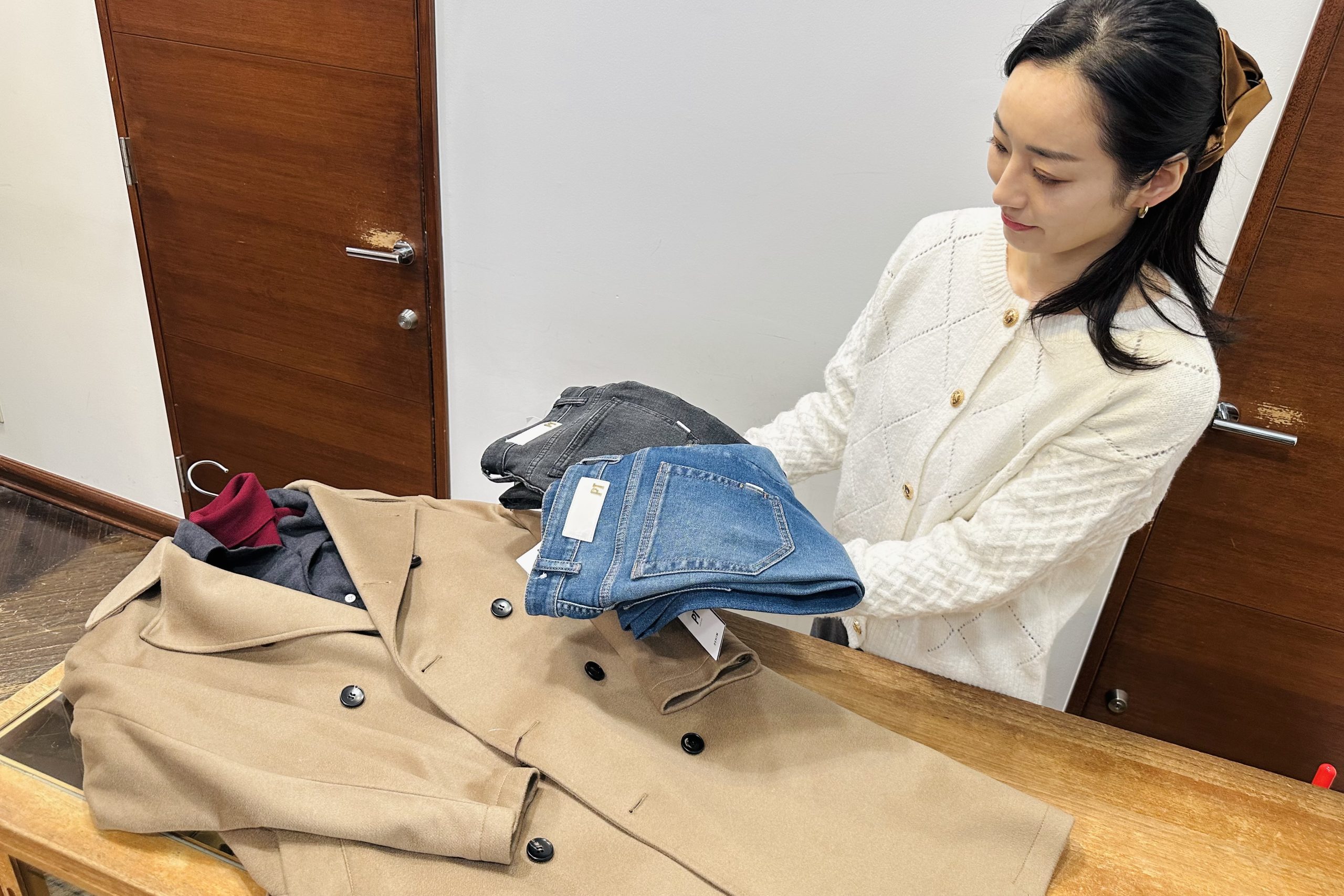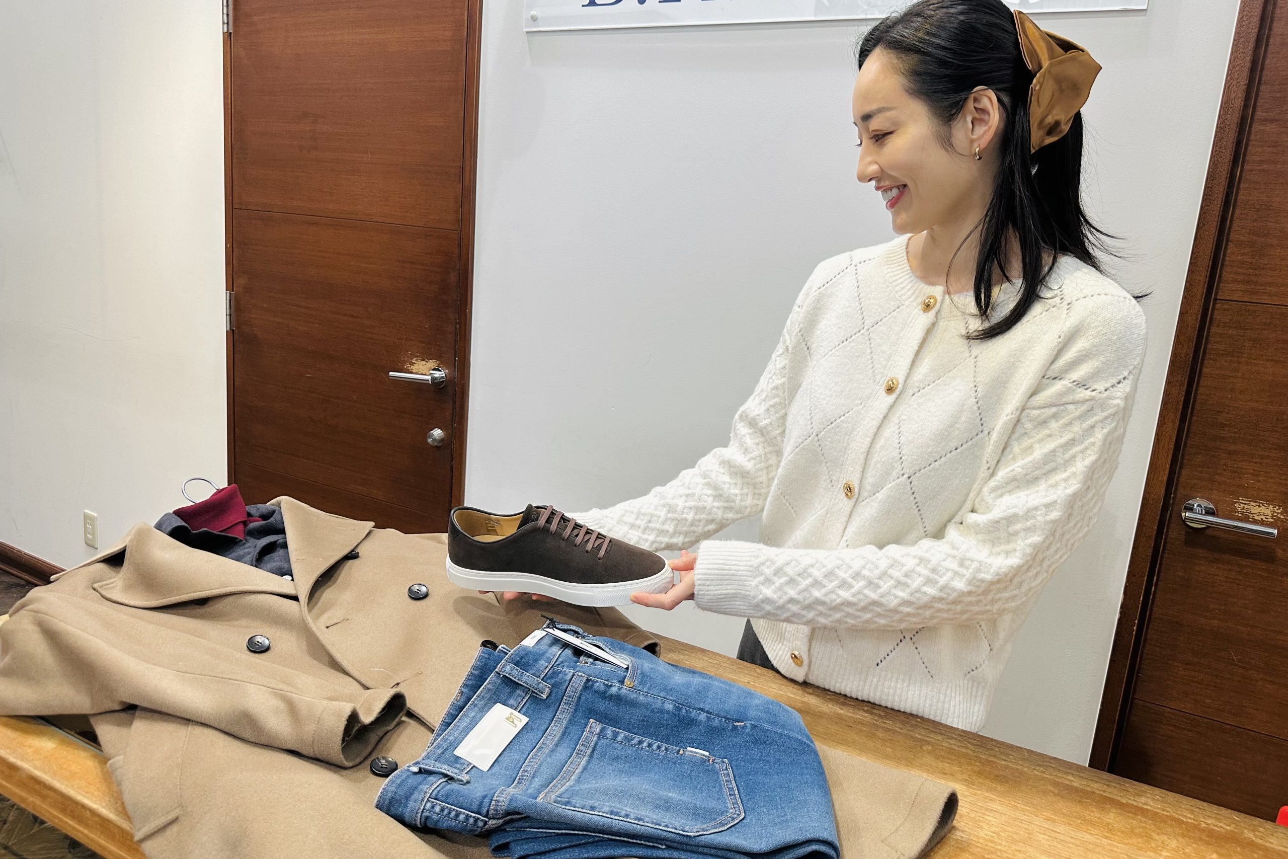 全体的にキレイめな印象なのでスラックスでも良いですが、今回はインディゴのデニムを選んで大人のこなれ感を演出します。