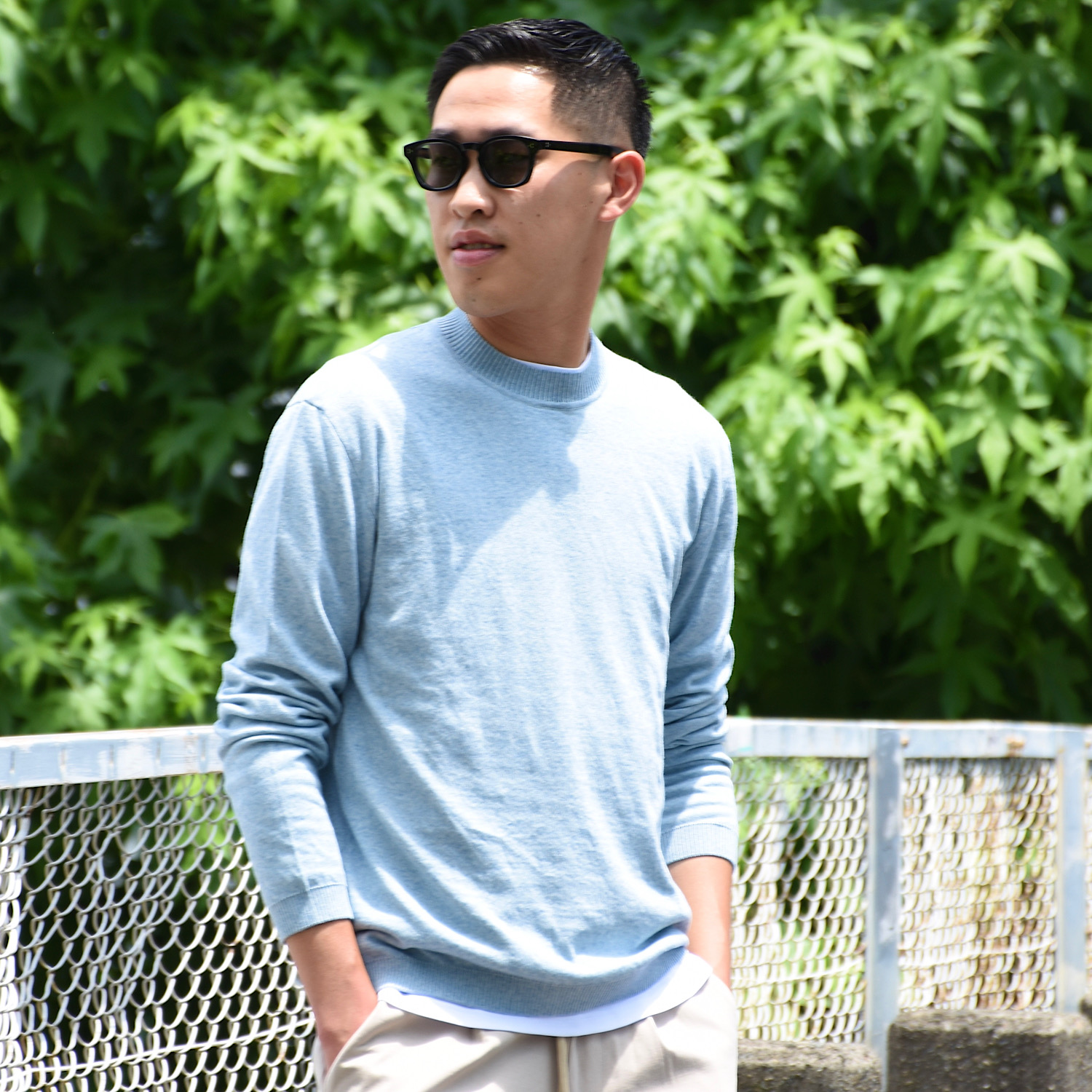 ・小顔効果がある太フレームが採用され、フロント側ではキーホールブリッジと三点鋲がポイントとなり、サイド側では存在感のあるテンプルがヴィンテージなムードを漂わせます。