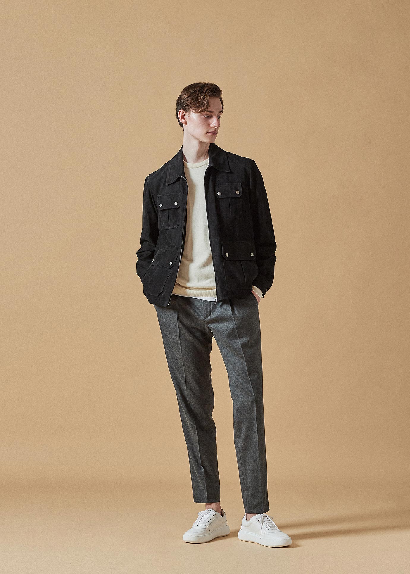・適度に確保された股上により、安心感ある腰廻りのフィッティング。プリーツの入ったやや余裕ある腰廻り、美しく流れるテーパードラインが"TAPERED FIT"の特徴です。絶妙なバランスゆえ、トップスを選ばず、足元もドレスシューズからスニーカーまで、品の良いムードはそのままにどんなスタイルでも合わせられるのです。