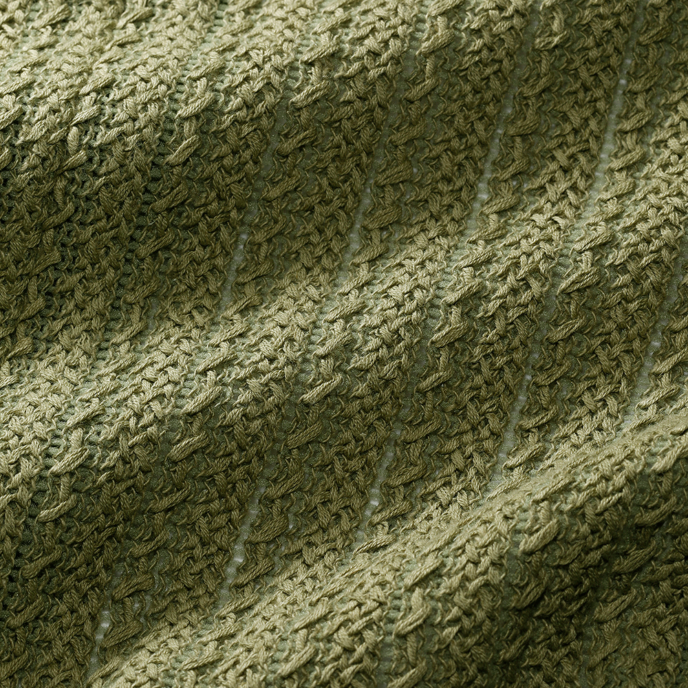 ・コットンベースゆえ程良くしっかり感のある編み地。シワにもなりづらく軽量で清涼感のある着心地です。