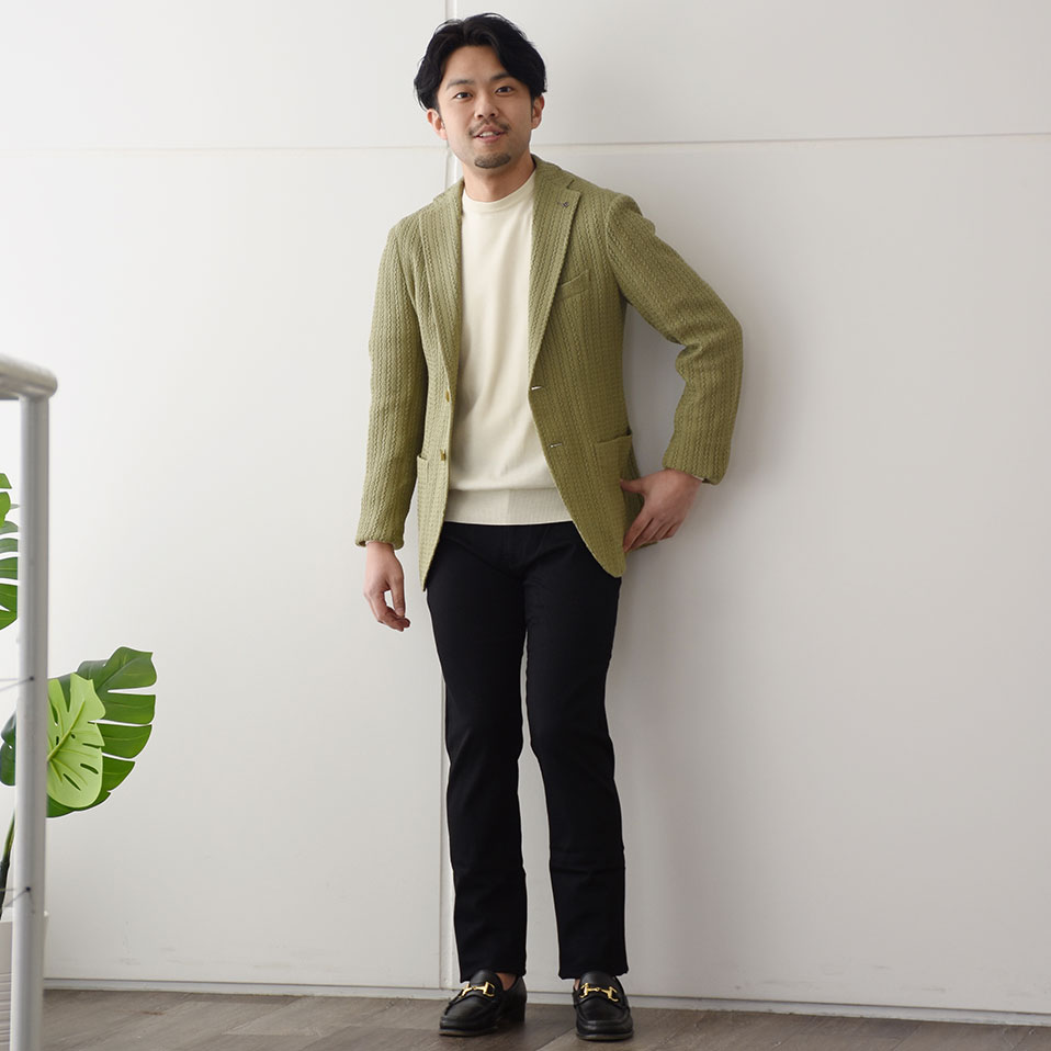 ・編み柄自体の主張はあるものの、単色なので悪目立ちはしません。着用シーンの幅広さを感じることができる一着です。ブラックとオリーブの2色をラインナップ。