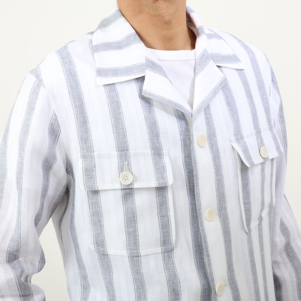 ・生地はリネン100%のボールドストライプ。白地の部分にも二種類の織柄ストライプが配されており、奥行きのある生地感です。目付けは220グラム。
