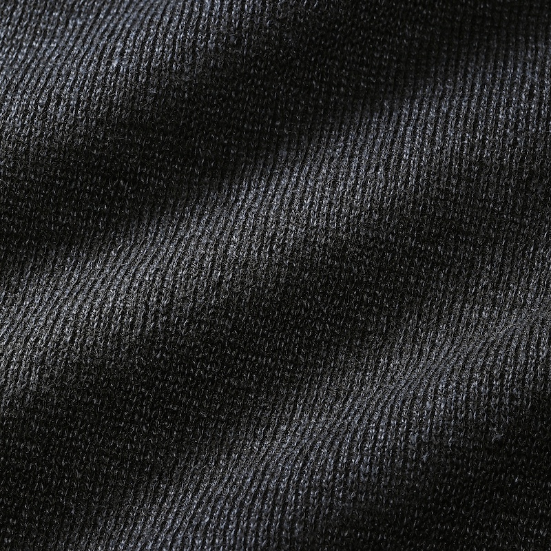 ・清涼感のあるコットンリネン糸をハーフミラノリブ(表面がミラノリブ、裏面は天竺編み)でしっかり編み上げた素材を使用。通常のミラノリブよりも軽量になり、詰まった編み地ながら柔らかでリラックスした着心地が魅力です。