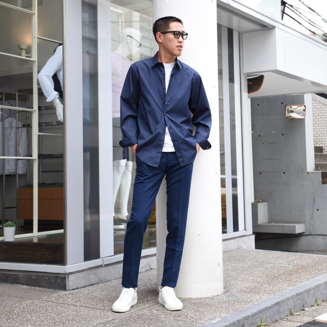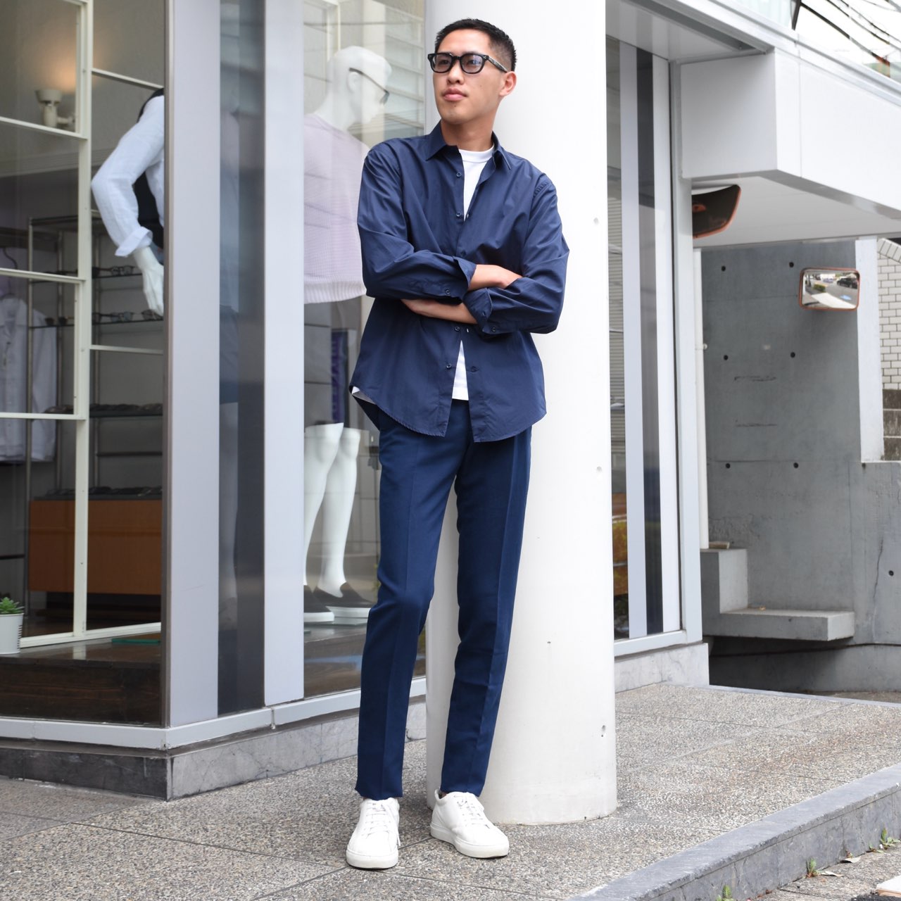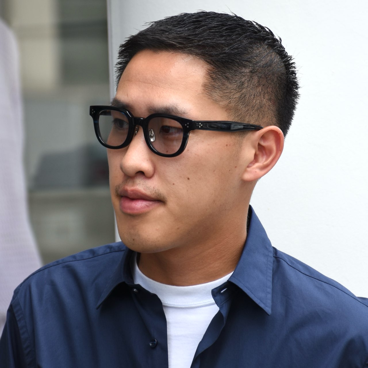 ・眉毛が隠れるほどのやや大きめのフレーム。こちらは知性的な印象で、どなたでも似合うような形です
