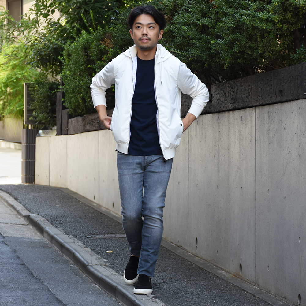 ・前身頃とフードには薄く中綿が入り、ストレッチナイロンを採用。袖と後身頃には薄手のコットンニットが配された異素材コンビネーションにより、夏以外は着用可能な一着。全面的にストレッチ性があり、シルエットはクセがなくスタンダード。軽量な点も特徴です。