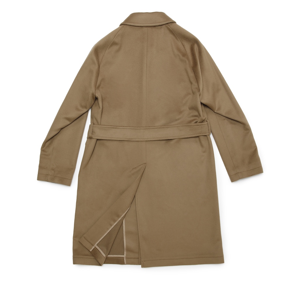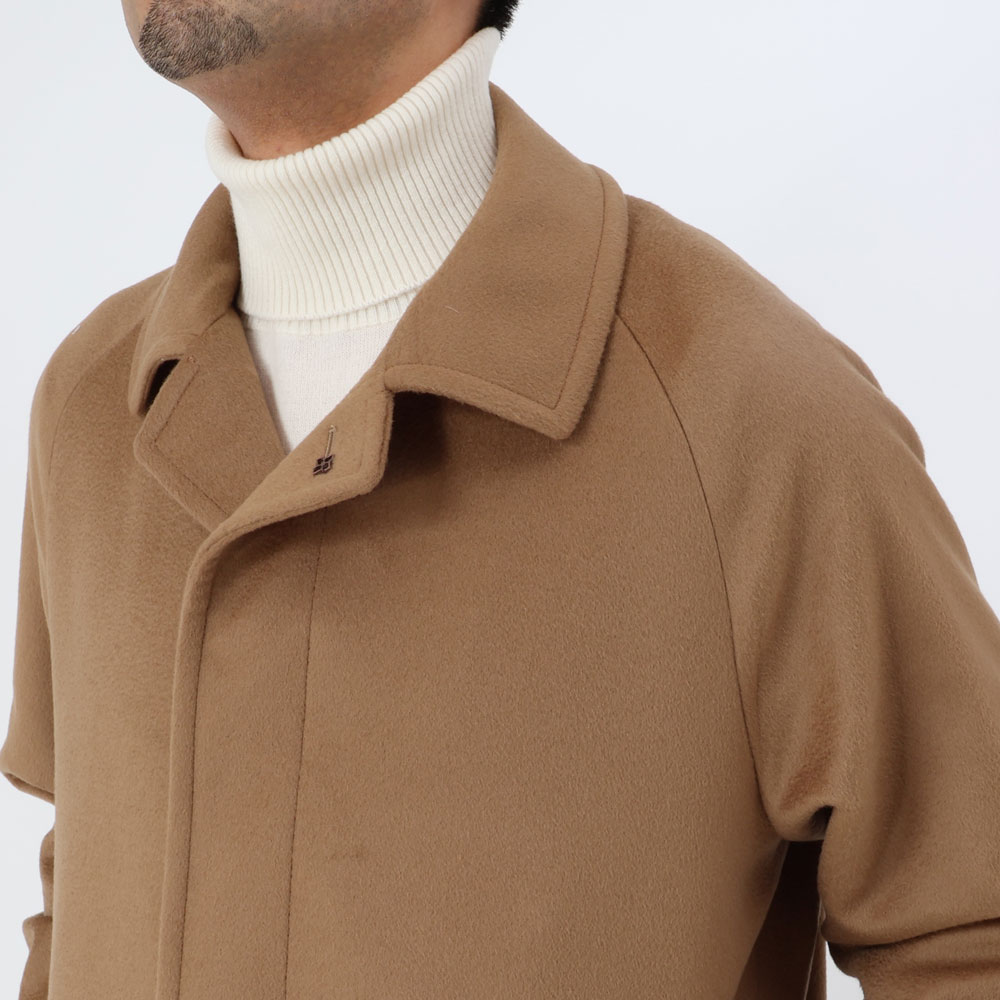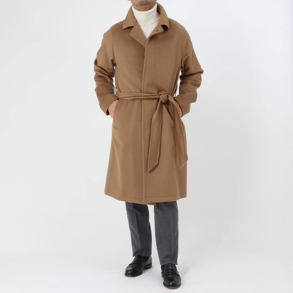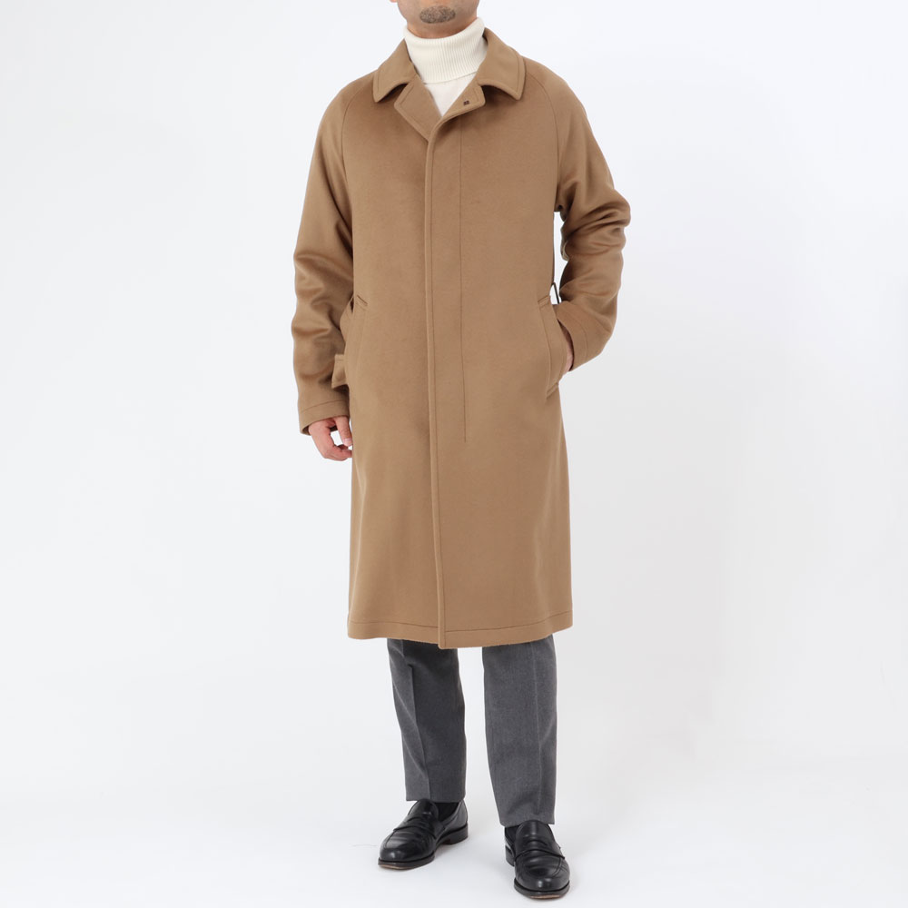 ・目付けは595グラムとコートらしい量感のある生地はヴァージンウール100%。毛足がビーバーのように整えられた綺麗な風合い、柔らかな手触りが特徴です。2色(キャメル/ダークネイビー)のラインナップ。