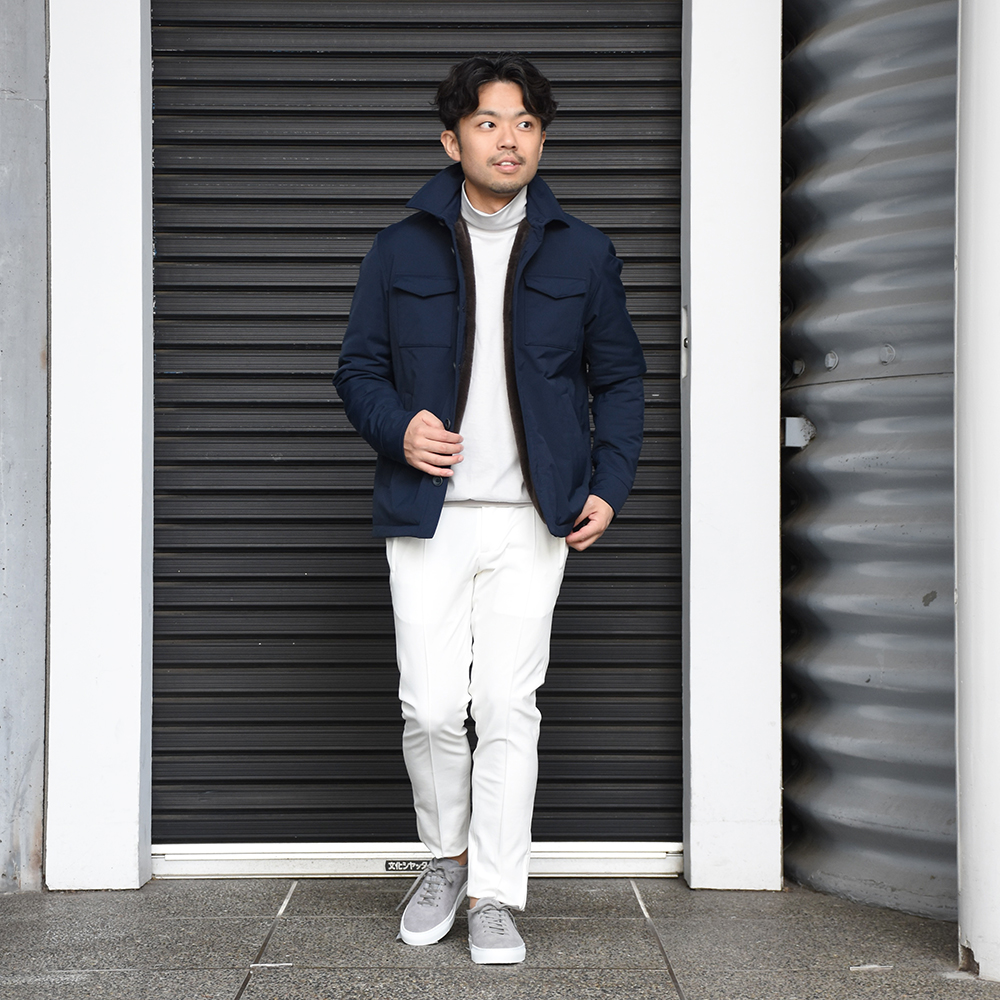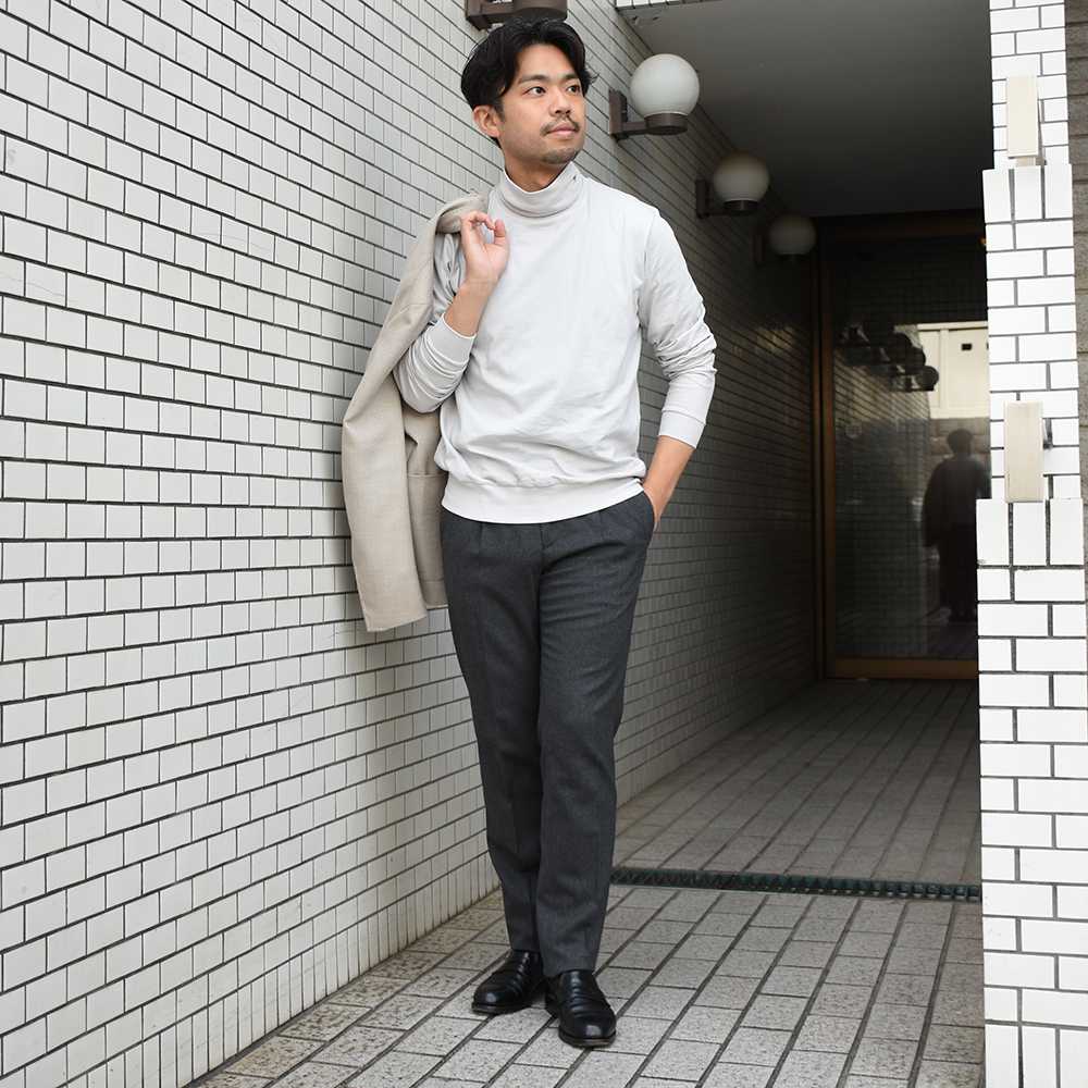 ・ネックが高いタートルネックはジャケットやアウターを着る際の強い味方。汚れ移りを防ぎます。もちろん一枚で着てもさりげなく洒落っ気を醸すアイテムです。
