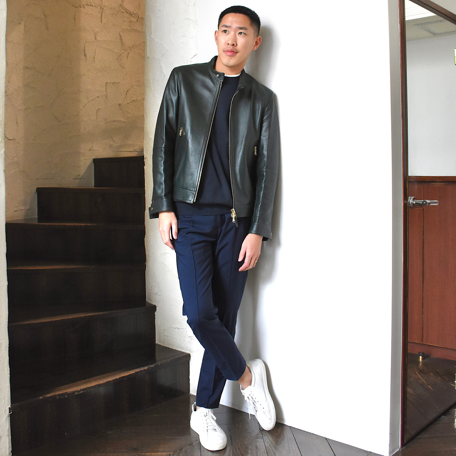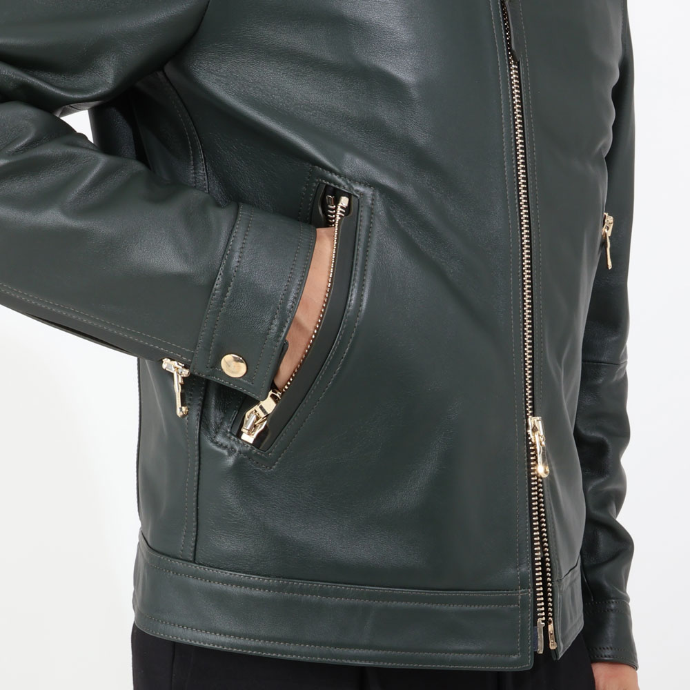 ・レザーの色合いにもご注目ください!深みのあるグリーンとブラウンのため、ブラックが合うのはもちろんのこと、ネイビーやグレー、そしてベージュのインナーやボトムズとコーディネートできます。レザーの色合いだけでさりげなく、でもいつもと異なる新鮮なスタイリングが完成します。