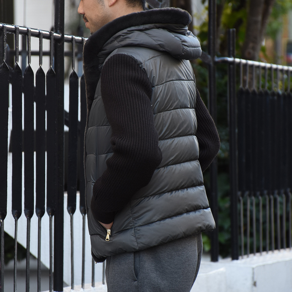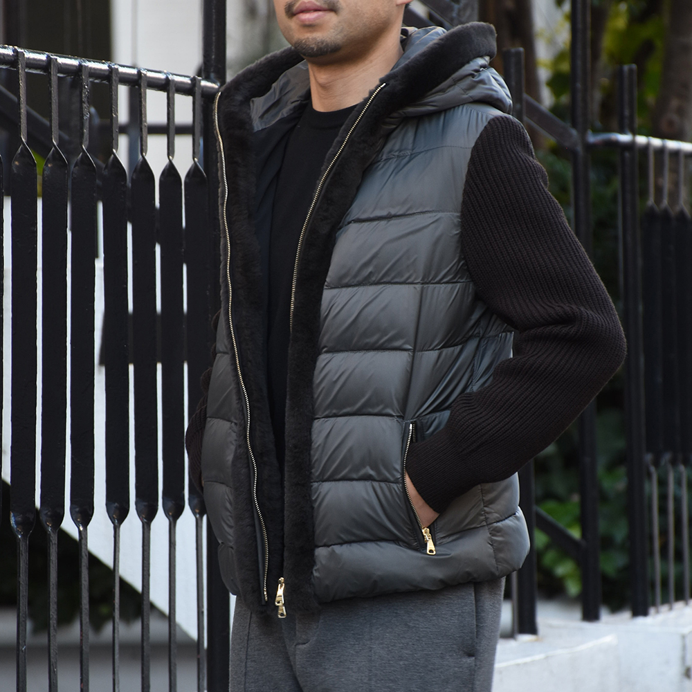 ・身頃のみがダウンなので温暖化傾向のある現代でもオーバースペックにはならず、伸縮性に富んだニットスリーブで動きやすく、ムートンによりラグジュアリーさが加えられた、というまさにハイブリッドアウター。