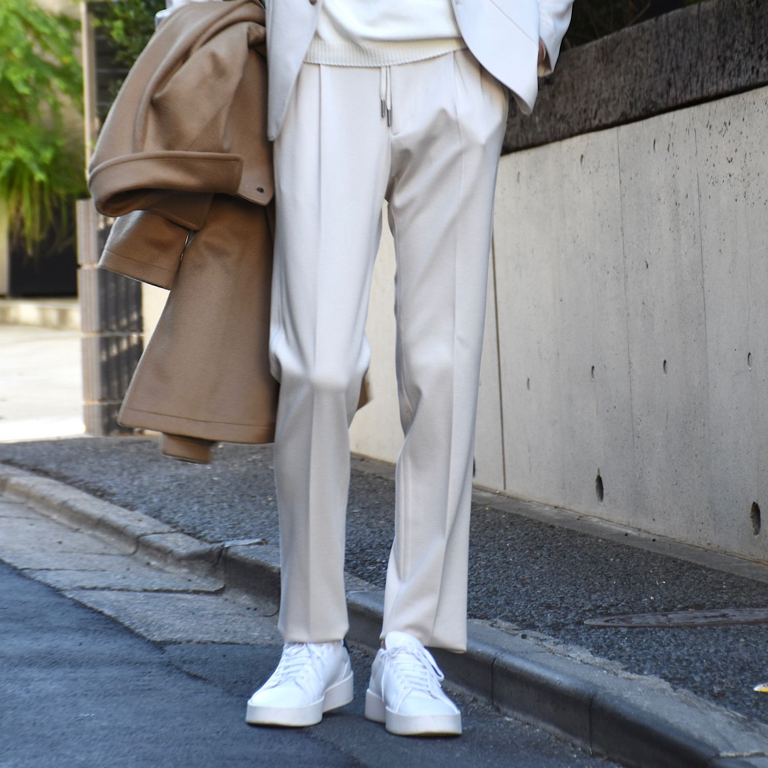 ・組下となるのは、ウエストシャーリンゴム&ドローコード付きのリラックスパンツで1プリーツ。腰廻りとワタリはほんのりゆとりがありつつも、美しくテーパードしたシルエットによってスッキリとした印象を与えます。