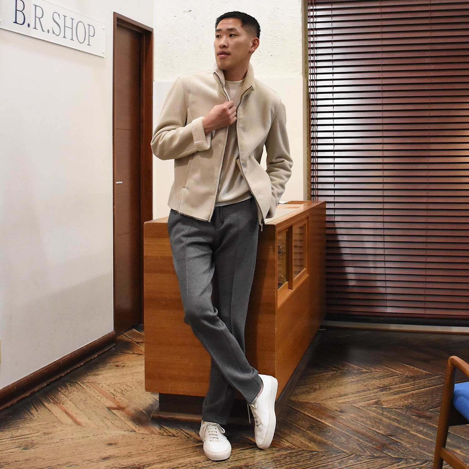 ・モデルはベーシックなボンバージャケット。削ぎ落とされたストイックなデザイン/ディテールだからこそ、素材の良さとスタンダードなシルエットが際立ちます。