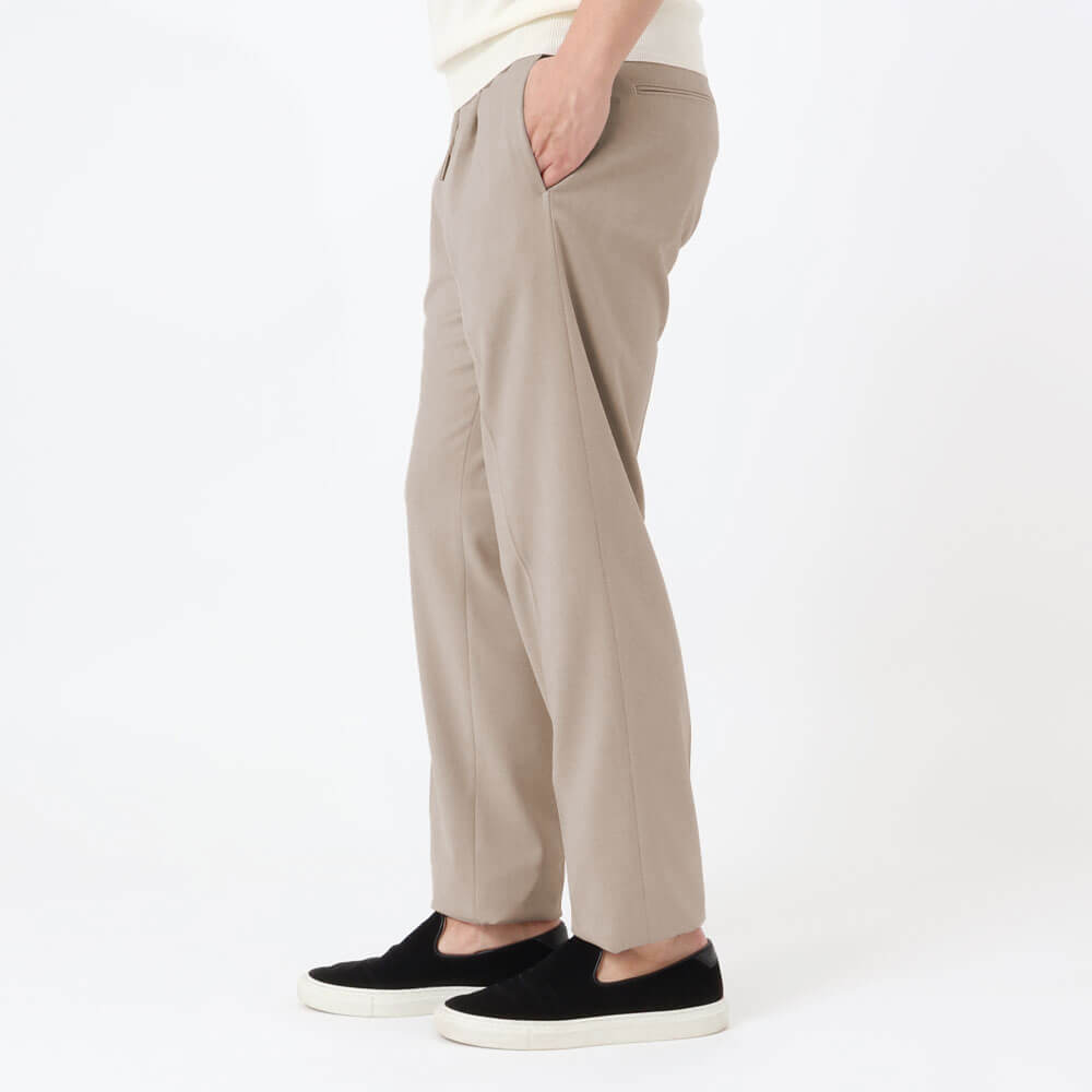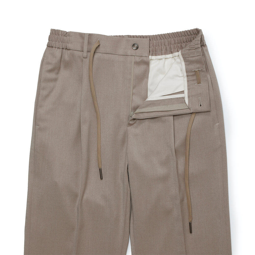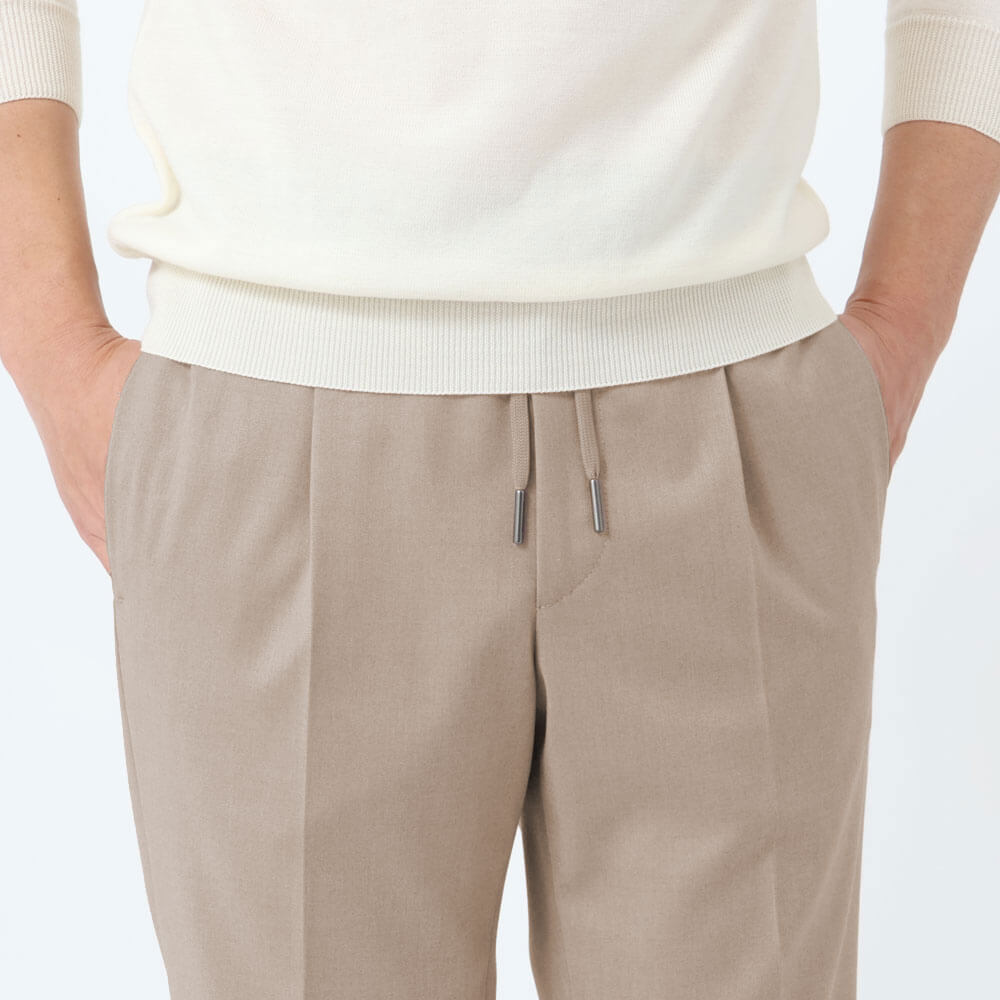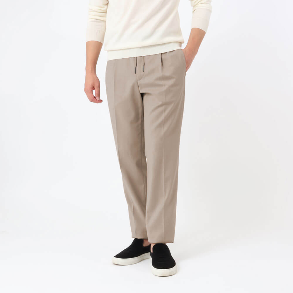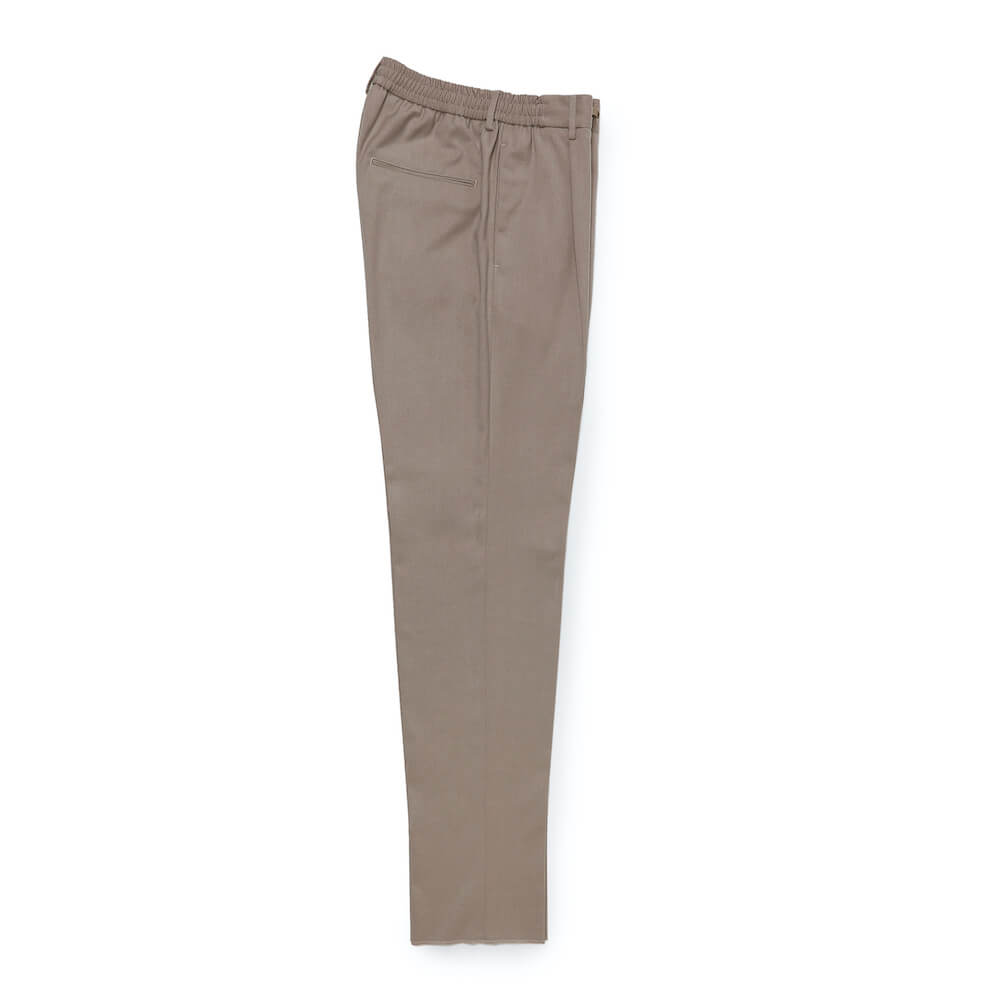 ・組下となるのは、ウエストシャーリンゴム&ドローコード付きのリラックスパンツで1プリーツ。腰廻りとワタリはほんのりゆとりがありつつも、美しくテーパードしたシルエットによってスッキリとした印象を与えます。