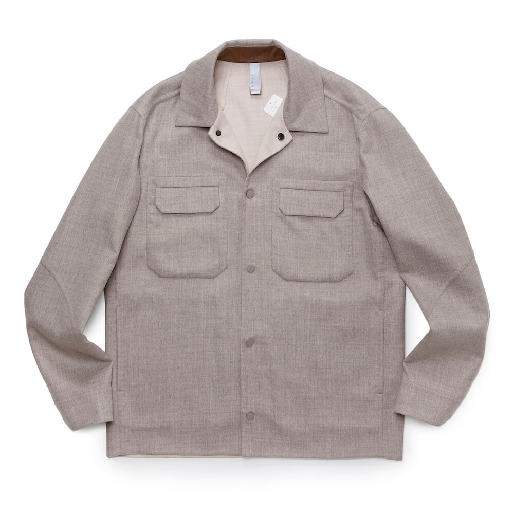 ・こちらはシルバーのドットボタンが都会的なアクセントとなるシャツ型ブルゾン。ボックスシルエットながらスッキリとしており、羽織るとスマートに映ります。