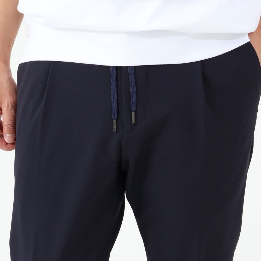 ・ウエストがゴムシャーリングというスポーティな仕様ながら、腰廻りが前から後にかけてカーブするようになっており、本格トラウザーズに近しい設計です。そのため腰廻りのフィット感が秀逸で、ベルトが付けられるようベルトループも付属。