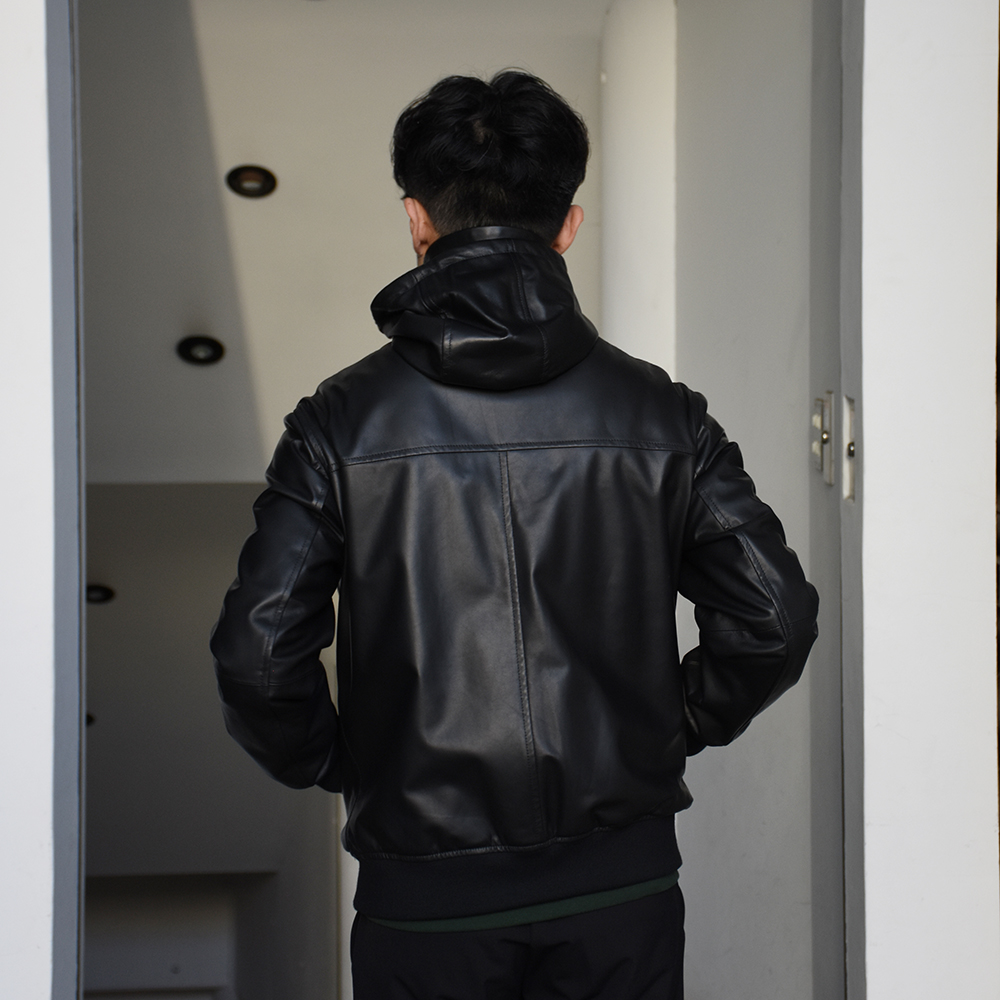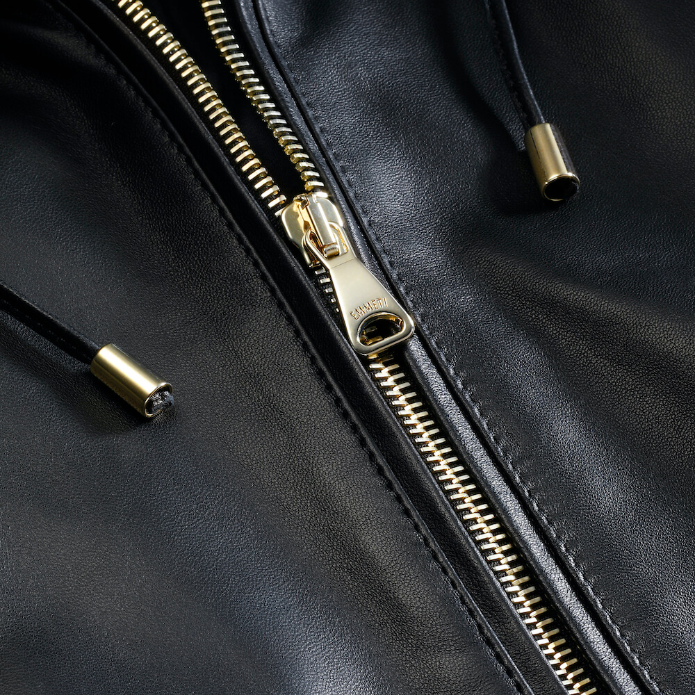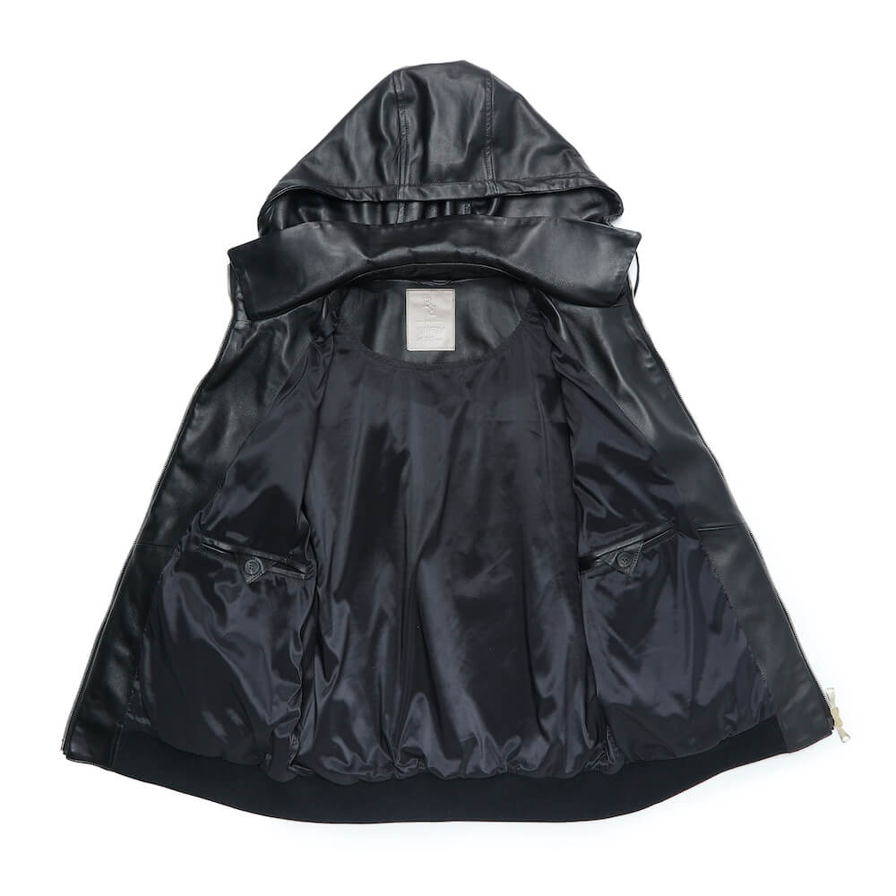・これによりレザーパーカーがさらに大人っぽく、またフロントジップをトップまで上げた際には台襟+襟で二重になり、フードが立ちやすくスタイリッシュに。