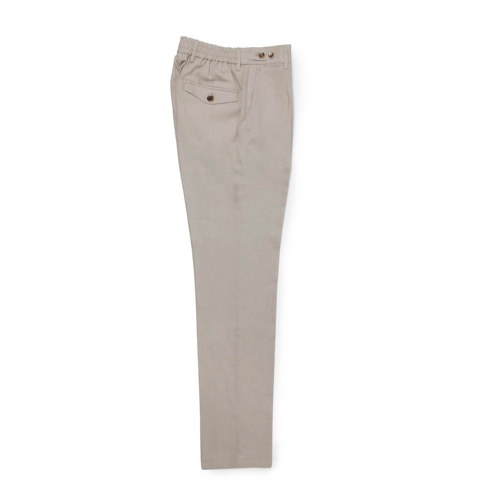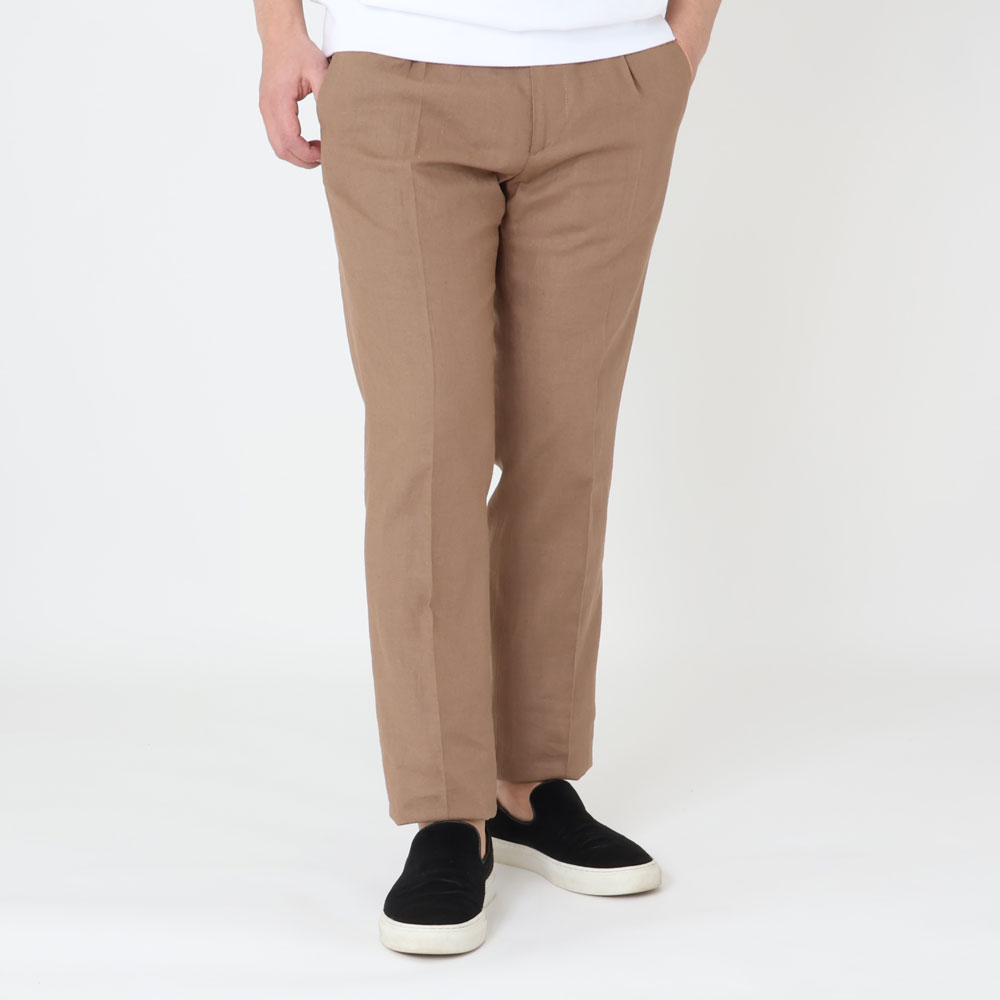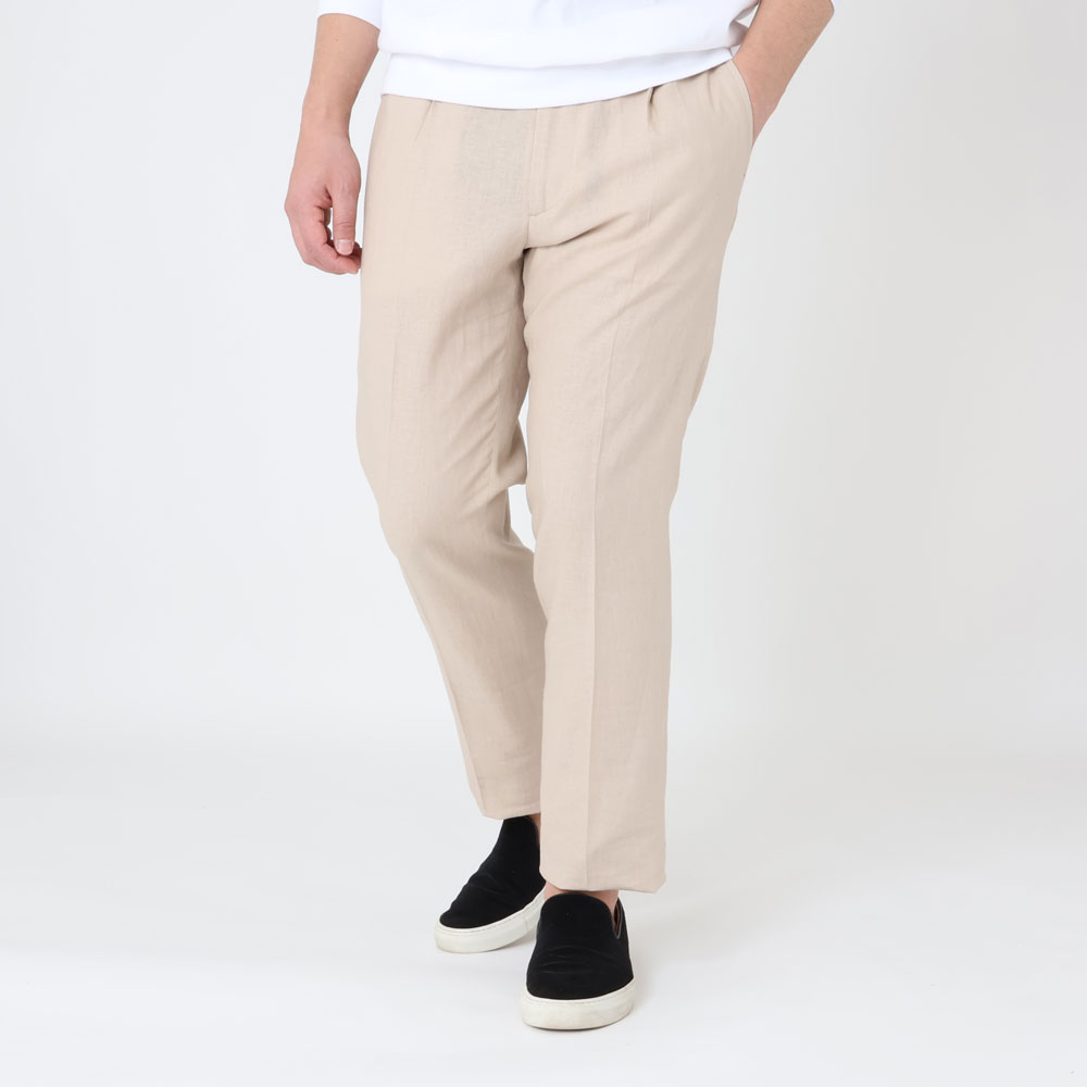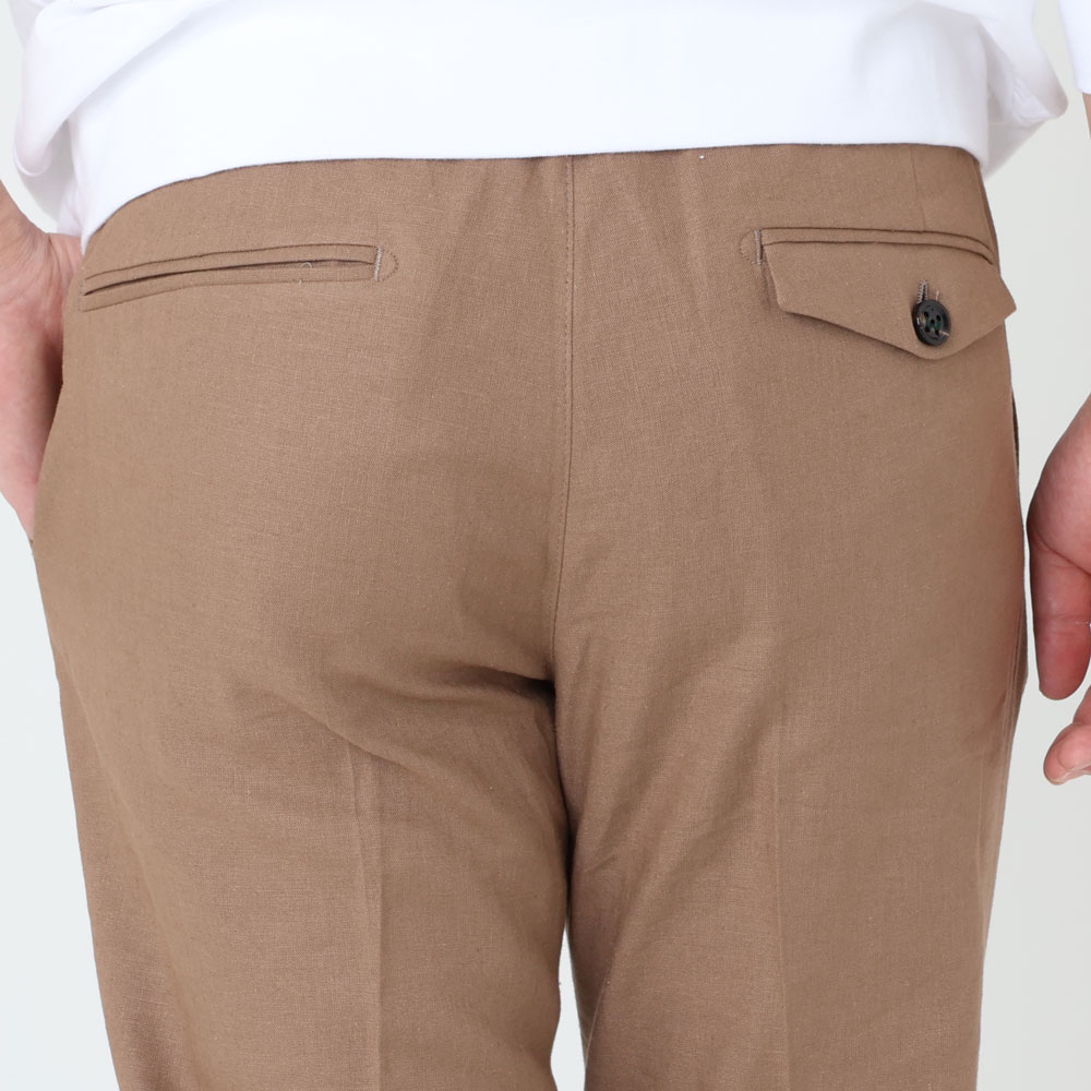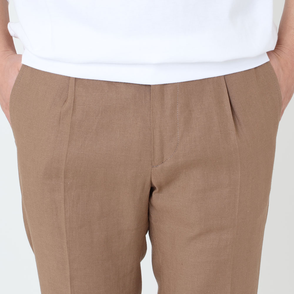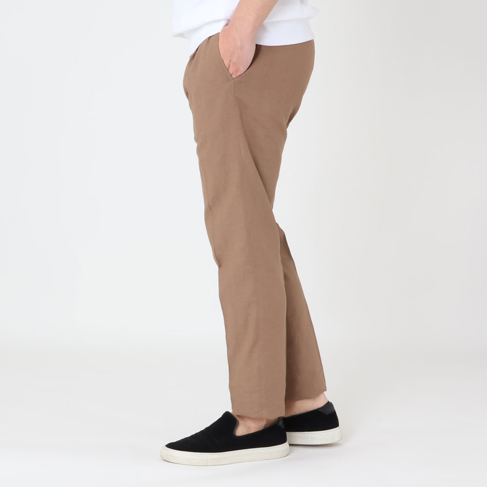・生地はリネンとヴィスコース(レーヨン)がブレンドされたキャンバス織り。薄手でリネンの清涼感とヴィスコースのトロみを持ち合わせており、夏向きの涼しい穿き心地です。全4色(ブラック/ネイビー)のラインナップ。
