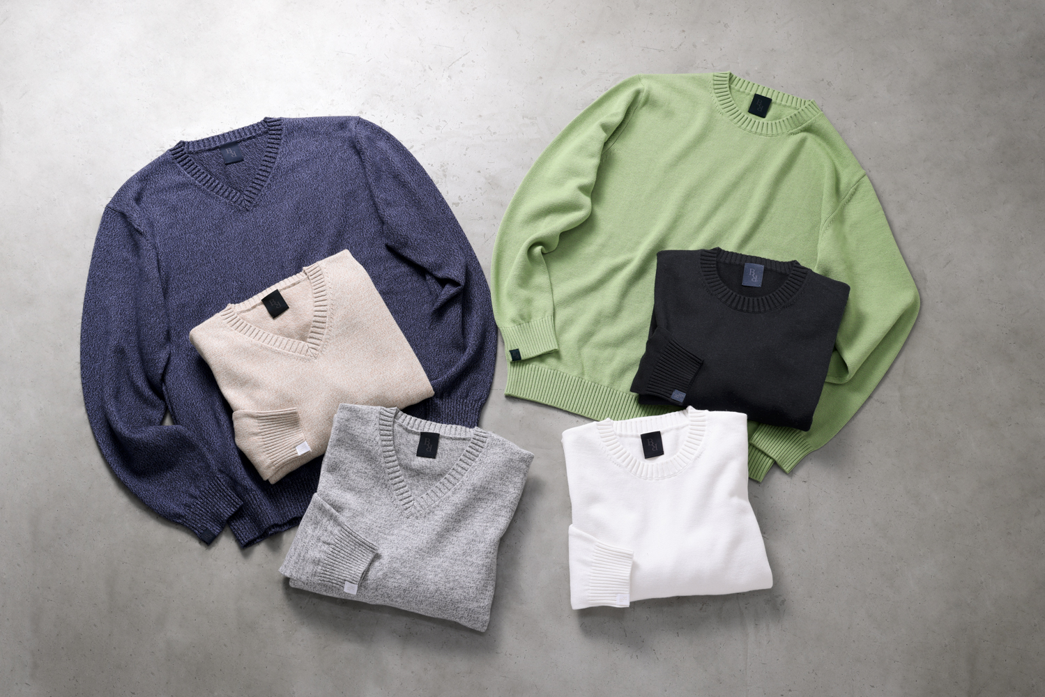 ・一年を通して着られるカシミア混コットンニットを目指し、試し編みを重ね、一般的なミドルゲージよりはやや薄手で軽快感のある天竺編みに決定。柔らかみがありながら、気温や湿度が高い春夏でもサラッとした風合いが快適で、秋や冬には温かみも感じられるような仕上がりに。