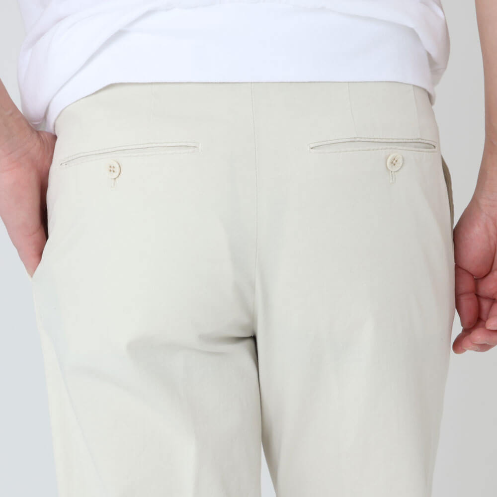 ・コットンをベースにリネンをブレンドしストレッチを効かせた生地は、後染めならではのこなれ感と春夏シーズンにピッタリな涼しげな風合いが特徴。ご自宅でケア(手洗い)できるお品物です。全3色(ライトグレーが今後入荷)のラインナップ。