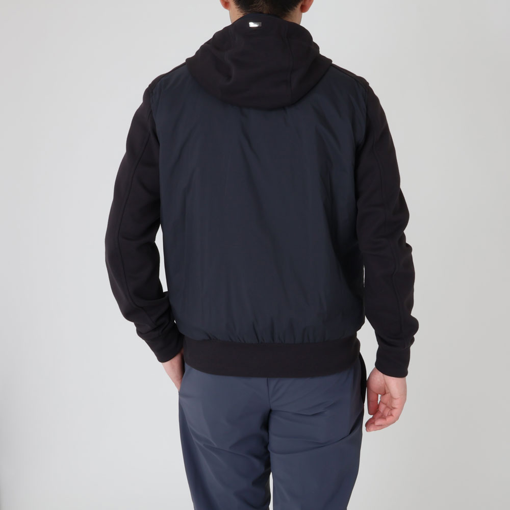 ・超極細糸で織られたナイロンとスウェットがコンビになった「HERNO(ヘルノ)」のジップアップパーカーは、二素材ともに撥水性があり、軽く柔らかな点が特徴。