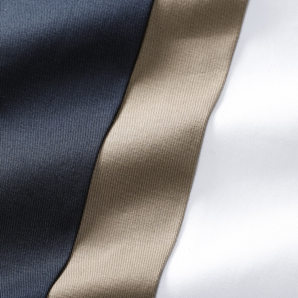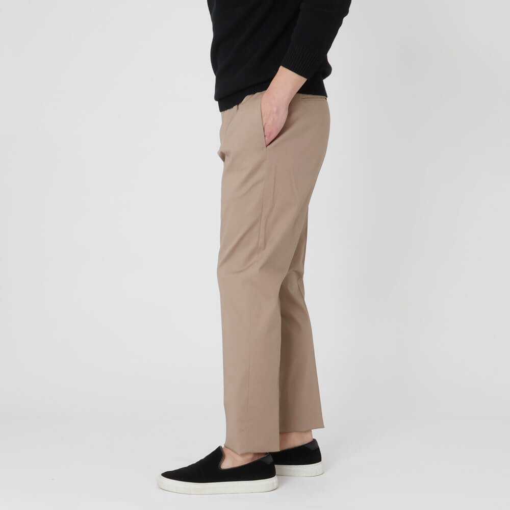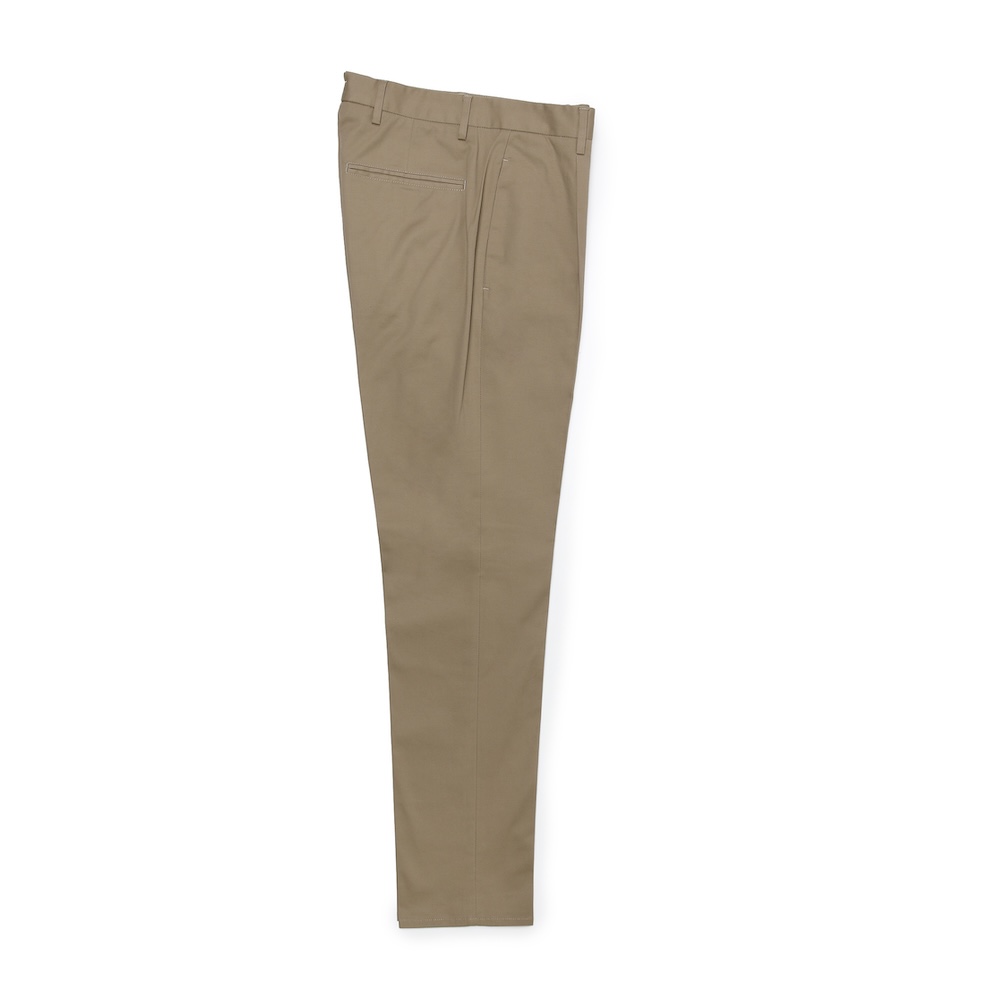 ・先染めのコットン生地は、細かな綾織りで清潔感があり端正な印象。ドライなタッチ、ストレッチが効いており、使い勝手の良い一本です。全3色をラインナップ。