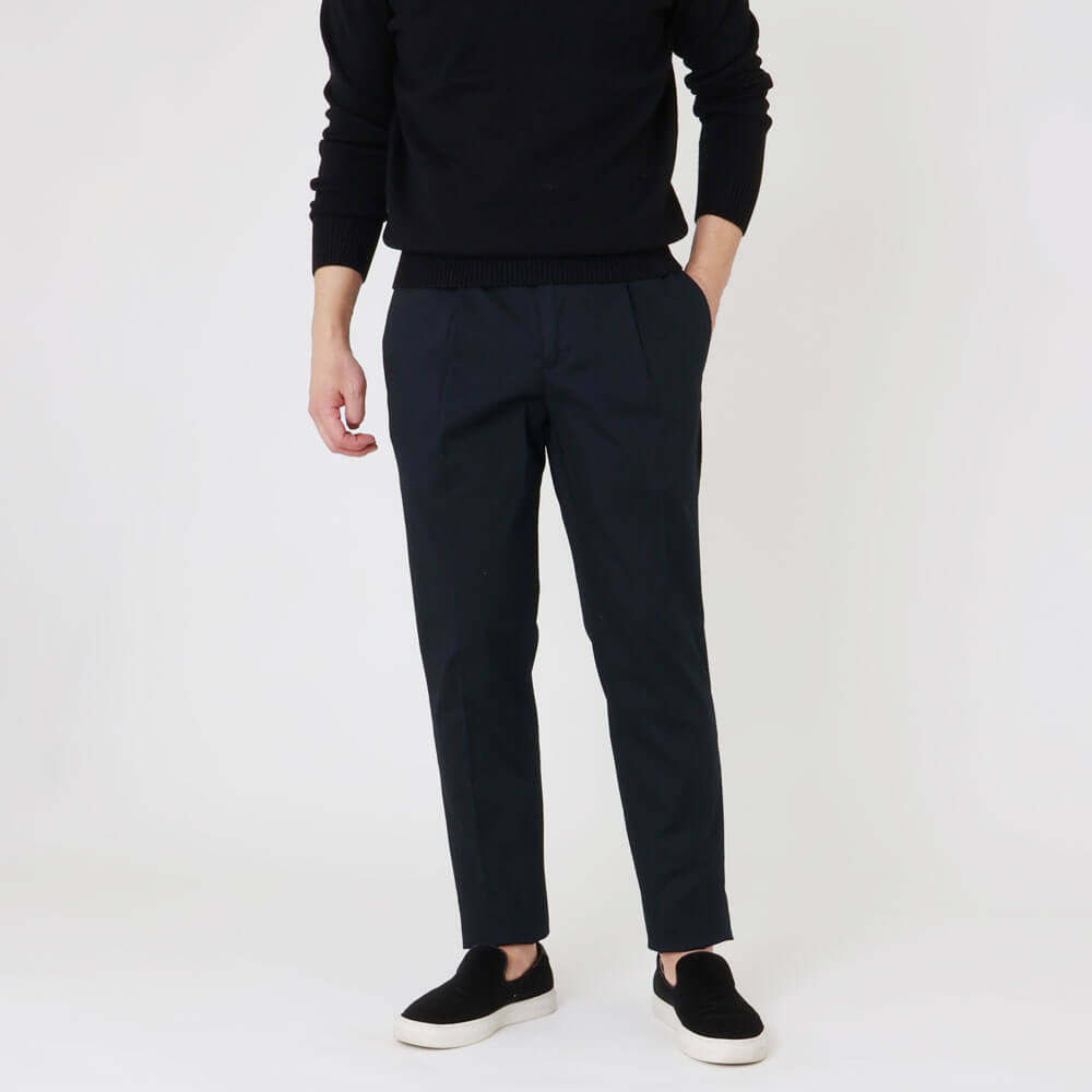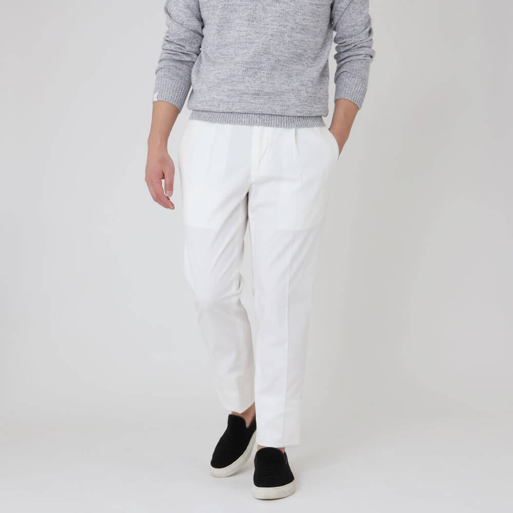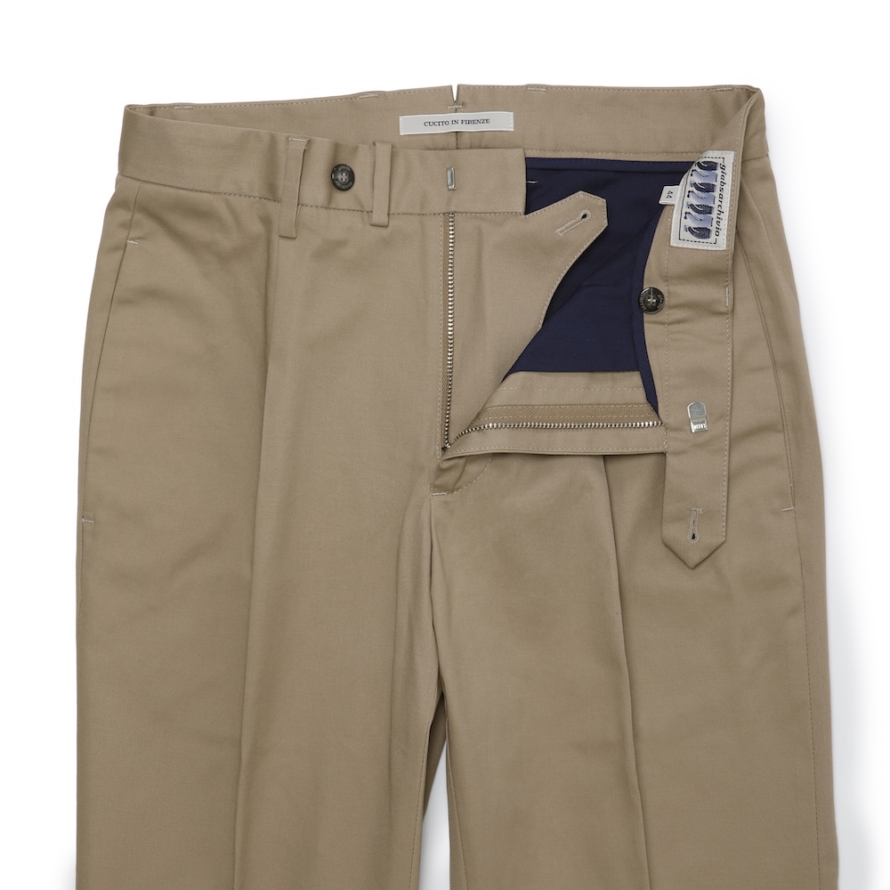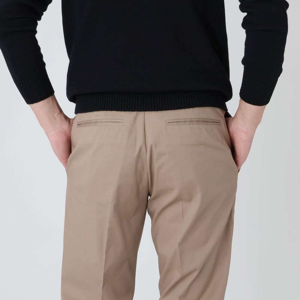 ・先染めのコットン生地は、細かな綾織りで清潔感があり端正な印象。ドライなタッチ、ストレッチが効いており、使い勝手の良い一本です。全3色をラインナップ。